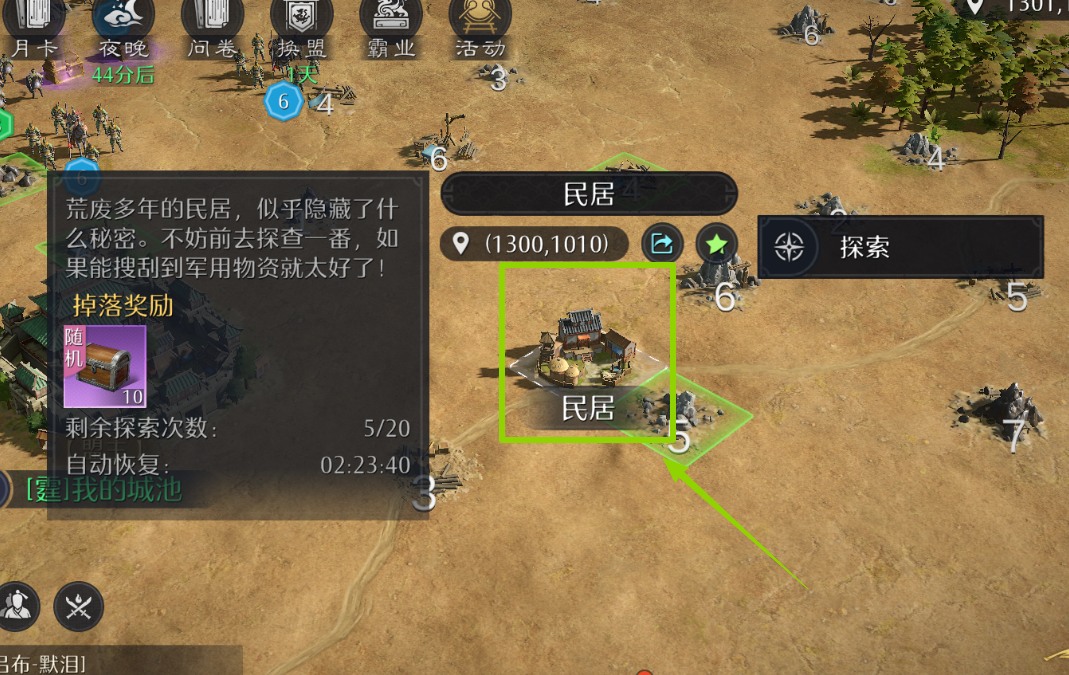 - 一是在沙盘地图上探索民居,等级越高的民居可以获得的奖励越多,探索次数会随时间自动恢复,最多可以积攒20次