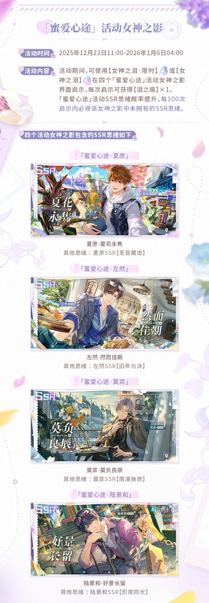活动期间,使用【女神之泪·限时】或【女神之泪】在四个「蜜爱心途」活动女神之影界面启示,每次启示可获得【泪之痕】×1。每100次启示内必得该女神之影中未拥有的SSR思绪