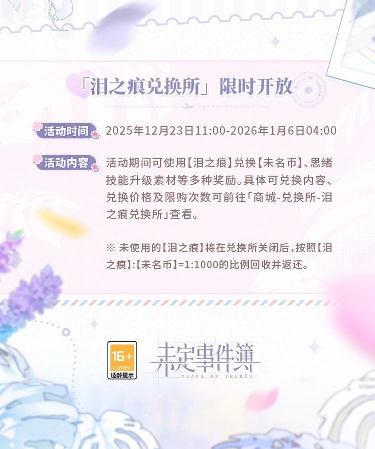 【活动内容】活动期间可使用【泪之痕】兑换【未名币】、思绪技能升级素材等多种奖励。具体可兑换内容、兑换价格及限购次数可前往「商城-兑换所-泪之痕兑换所」查看