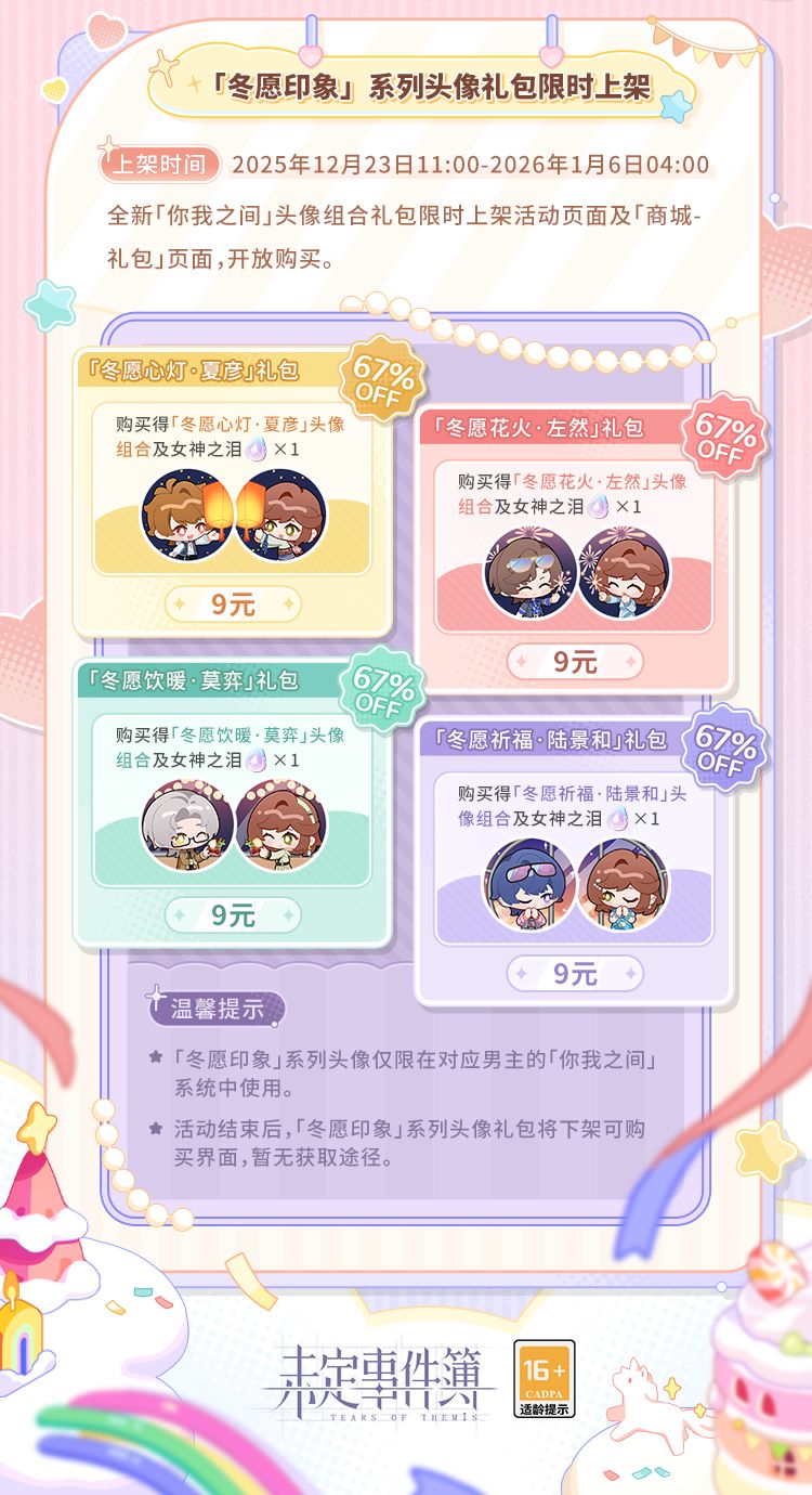 2025年12月23日11:00,「绮乐环游记」限时活动即将开启!「冬愿印象」系列头像礼包限时上架!