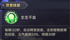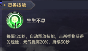同时赋予其独特的技能【生生不息】,该技能为被动技能,无需玩家操作释放,能够大幅提升击杀怪物所获得的经验,助您在游戏内升级快人一步;同时所获得元气提升20%,持续30秒(提升通天晓等级至玄灵期,元气最大加成提升50%)。