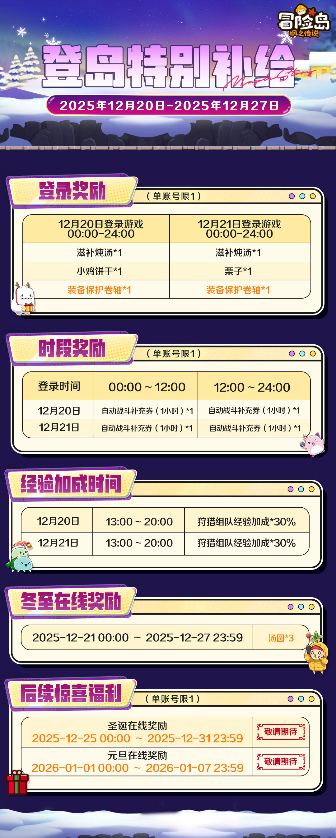 12月21日 00:00~24:00 登录游戏:滋补炖汤*1、栗子*1、装备保护卷轴*1