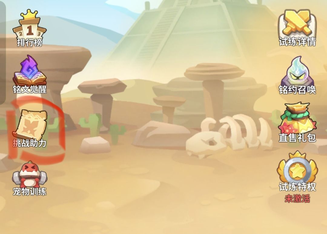 伤害的主要来源是挑战助力(如图),挑战助力优先选择风暴召唤系列,没有风就选择增益(如打断,净化,减料等),如果扛不住的话可以选择两三点啵啵抗伤系列,不过不能先拿会污染卡池,当助力都不理想的时候选择重启,优化自己的助力(500关即可解锁所有助力),助力最优时每天扫荡即可(升级铭文觉醒和抽取兽魂,慢慢的积累资源,刷新上限即可)。扫荡奖励是一致的,500关后开启宠物训练,选择宠物攻击即可。 然后铭文觉醒是永久的,所以会越打越强,试炼之匙每天会送30超过一百后不再送,重启之环的上限是十个,大家注意及时使用,避免浪费。