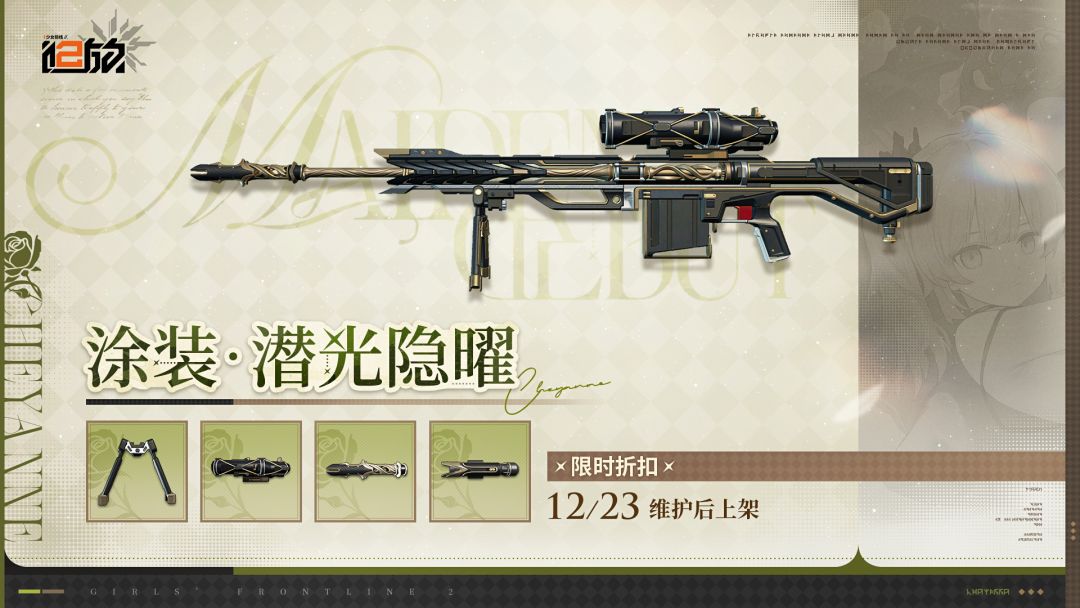尊敬的指挥官,12月23日维护后,全新主题套装【涂装·潜光隐曜】将限时上架个性涂装商城,并开启折扣售卖,欢迎指挥官届时前往。