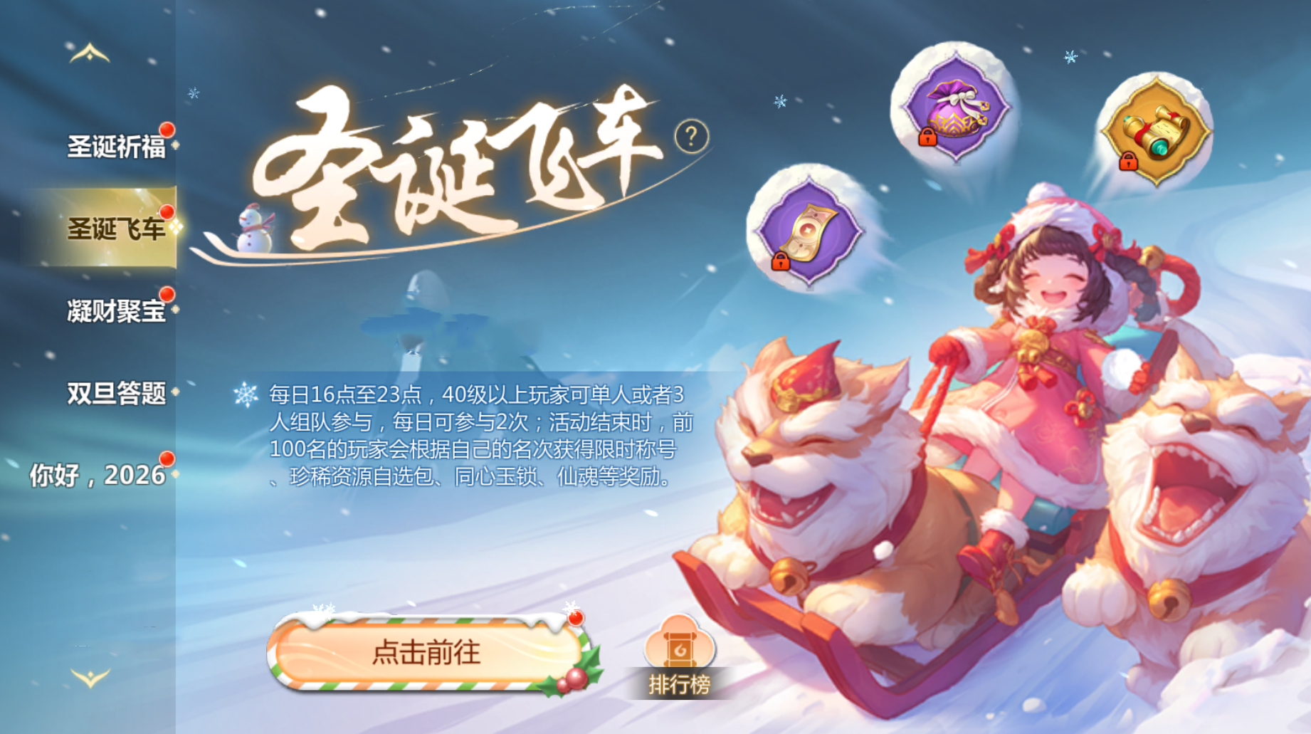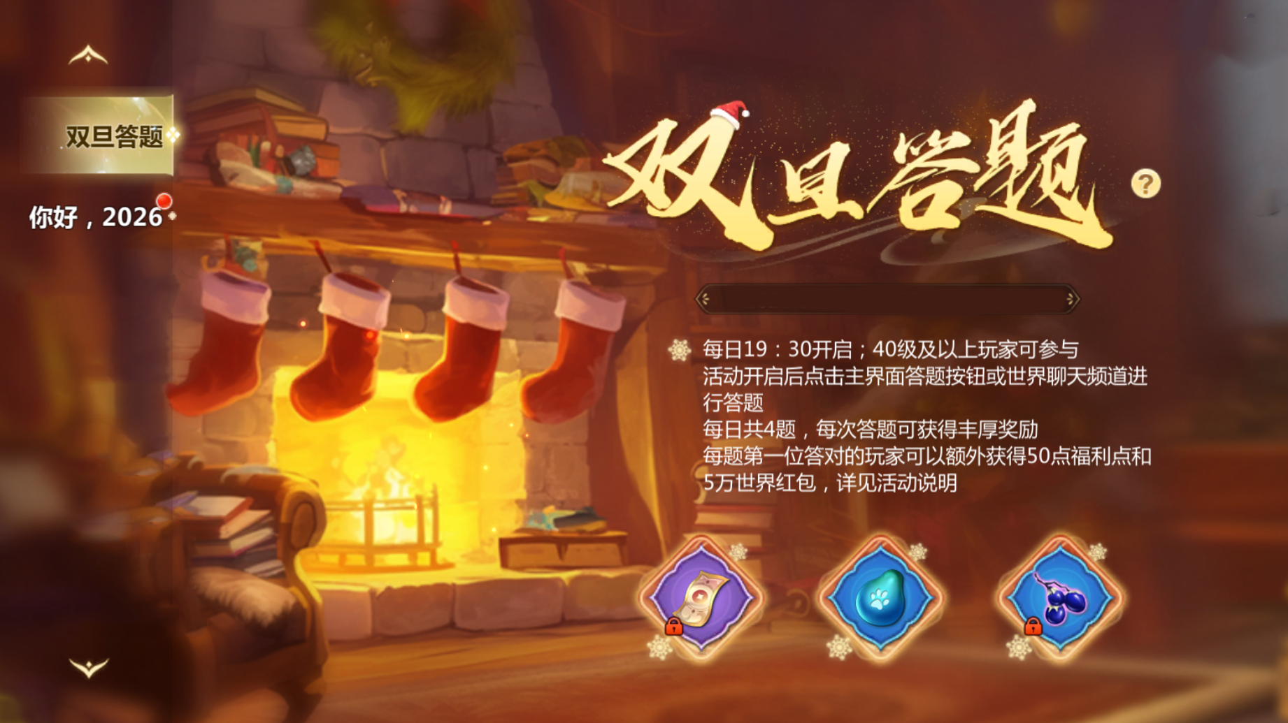 活动内容:活动期间,40级及以上玩家可参与双旦答题,每日共4题,参与答题即可获得丰厚经验、灵力和2026欢乐礼券,除此之外,每题第1位答对的玩家还可额外获得50点福利点和5万世界红包。
