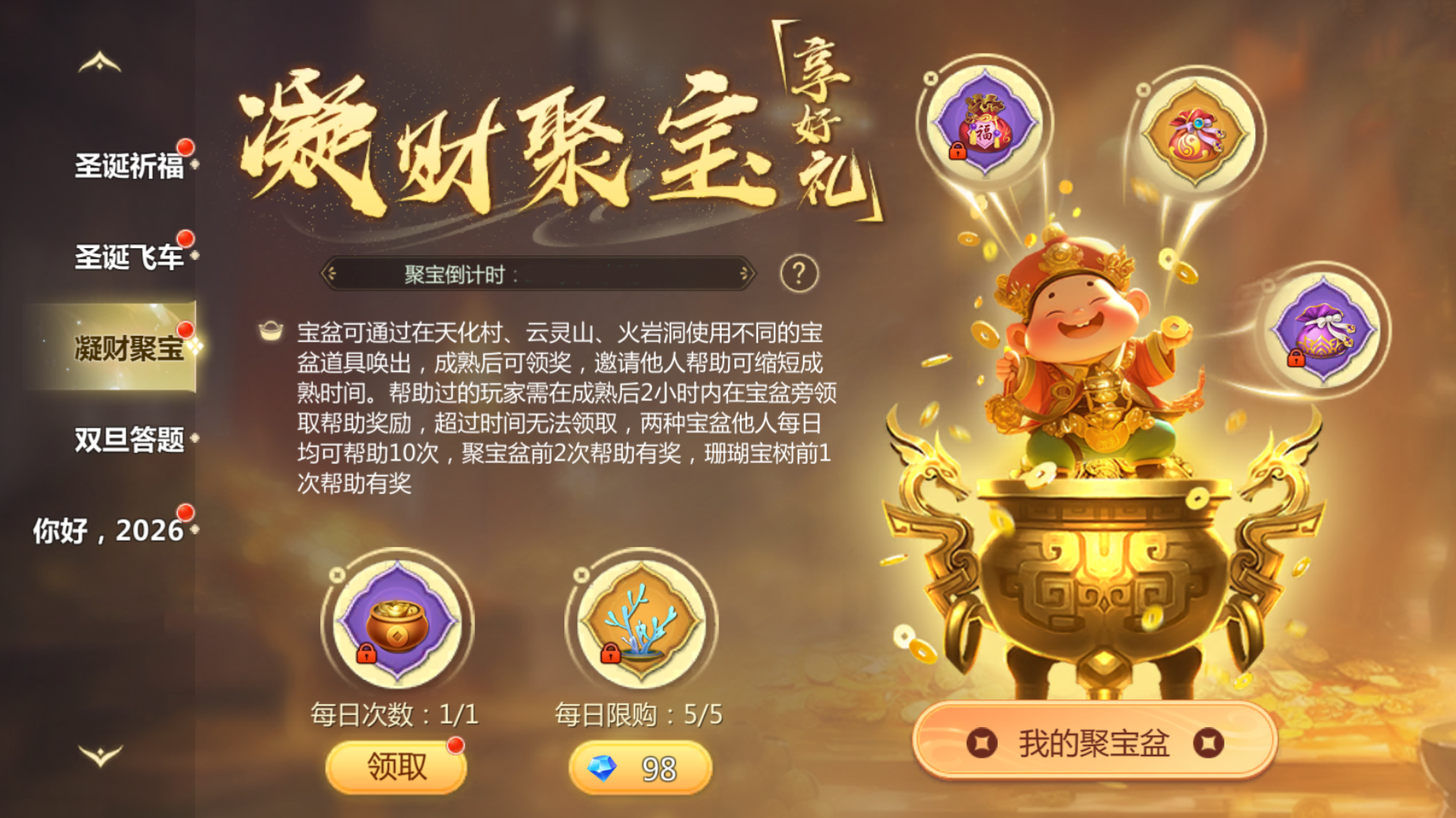 活动内容:活动期间,在指定地点使用聚宝道具可召唤出聚宝盆,聚宝盆可以被10人帮助,在特定地图种植成熟后即可获得奖励,帮助奖励每日有限制。