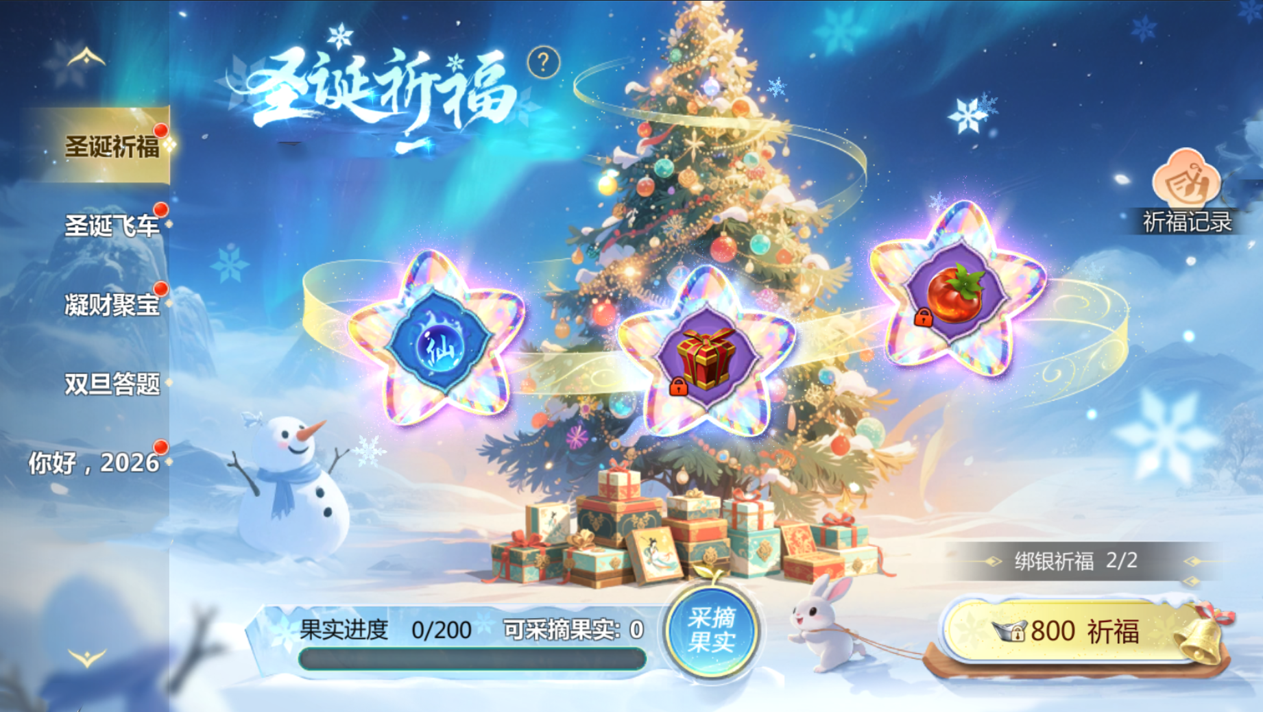 活动内容:活动期间,3级以上帮会且40级及以上的玩家可参与。每日可进行2次绑定银两/钻石祈福,每次祈福都可获得纯洁仙灵草*1、金兰花*2和仙魂*20,同时可提升圣诞祈福果实的成熟进度。