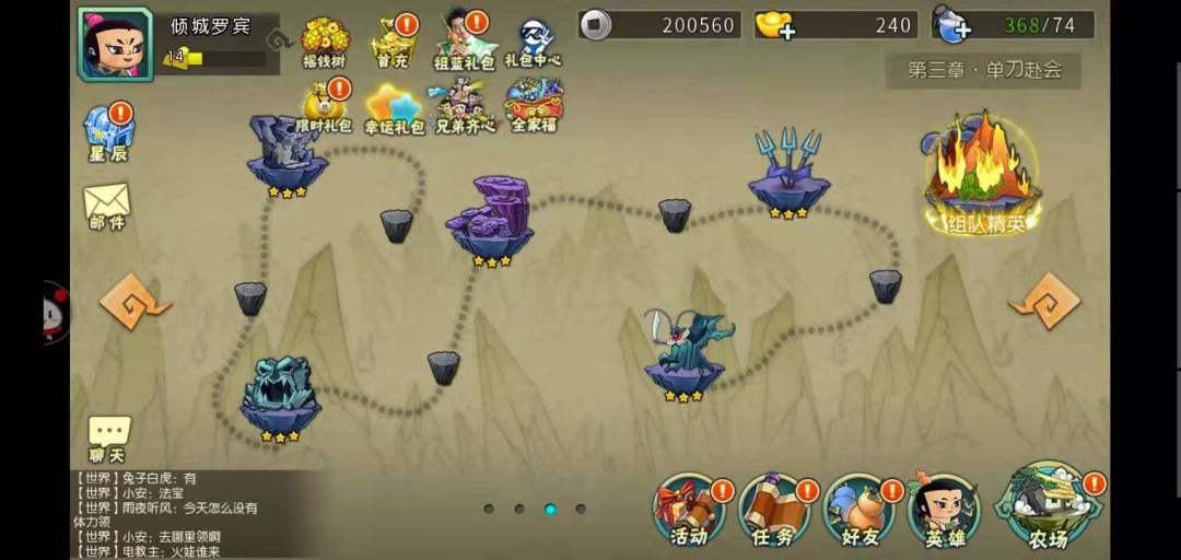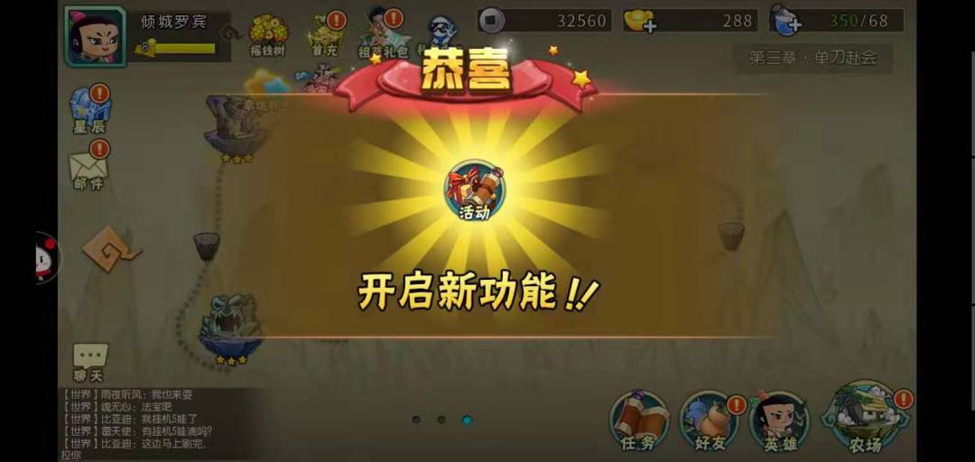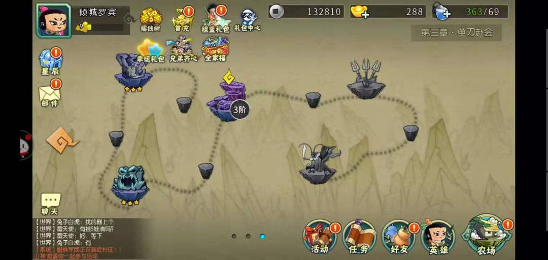 咱们继续推图第三章,还是用123kai始从第一小关kai始推,推不过的话就多買装备多进阶加属性,银币很重要的