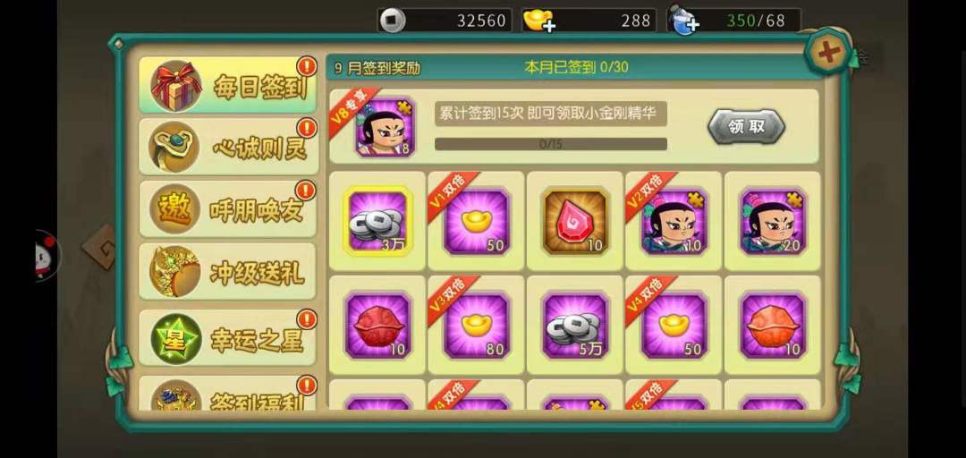 活动里最重要的就是签到,记得要天天签到拿免费给的资源,元宝可以用来摇钱树或者買体力等等