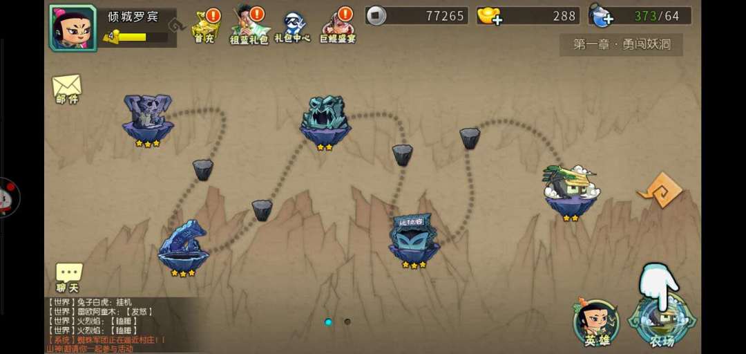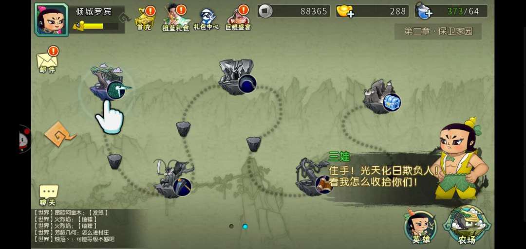 首先建议玩家们设置一个自己能记住的账号并绑定手机号和绑定密保,这样帐号就很安全了。当新手进入游戏后,会有几分钟的引导,当引导过后玩家手里会有大娃、二娃、三娃,你可以在英雄界面去升级娃娃技能和買娃娃装备来加属性,装备满了可以进阶,进阶后娃娃属性大幅度提升,先用123娃过些关后,就開始先主练大娃、二娃,三娃、四娃来推图过关。当通关第一章所有关卡后就会出现农场,在这里可以种植种子得到银币,银币用来買娃娃的装备和升级娃娃的技能等级用,如图所示。