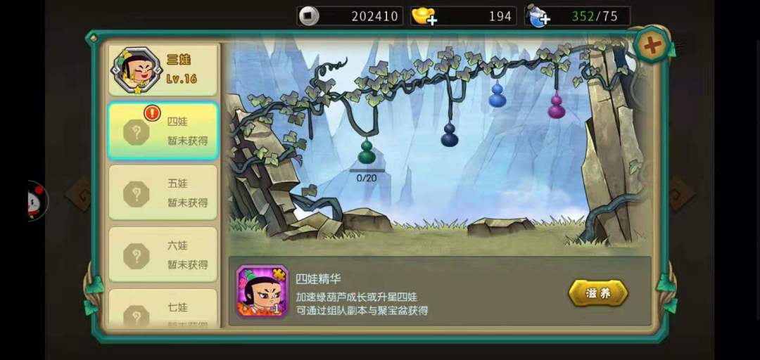新手玩家们,这是详细的葫芦娃游戏1-15级攻略的全过程,前期有四娃不难推图的,慢慢玩要多刷主力娃娃,娃娃升星升阶就会变的更厉害的,之后遇到推图难题的话可以参考社区其他章节的攻略,好了,最后祝新手玩葫芦娃游戏快乐!