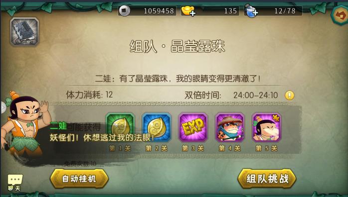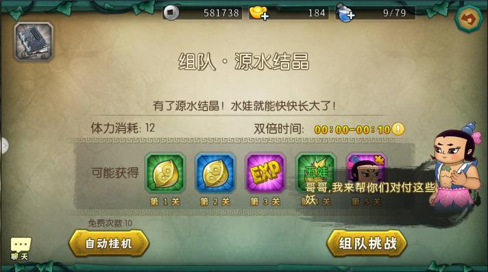 当通了第五章全部的时候就kai放五娃副本,在里面可以去刷五娃碎片的,,20个碎片就能出来,所以找个几个好友刷20次五娃,每次通关给一个五娃精华,需要通20次,以后kai始用五娃推图好用,因为五娃技能可以加血,用125推图好过。值得注意的一点是之前过的关卡如果是两星的话有必要再去打一次的争取三星过了,这样星星多了可以去左上角的星辰去领资源