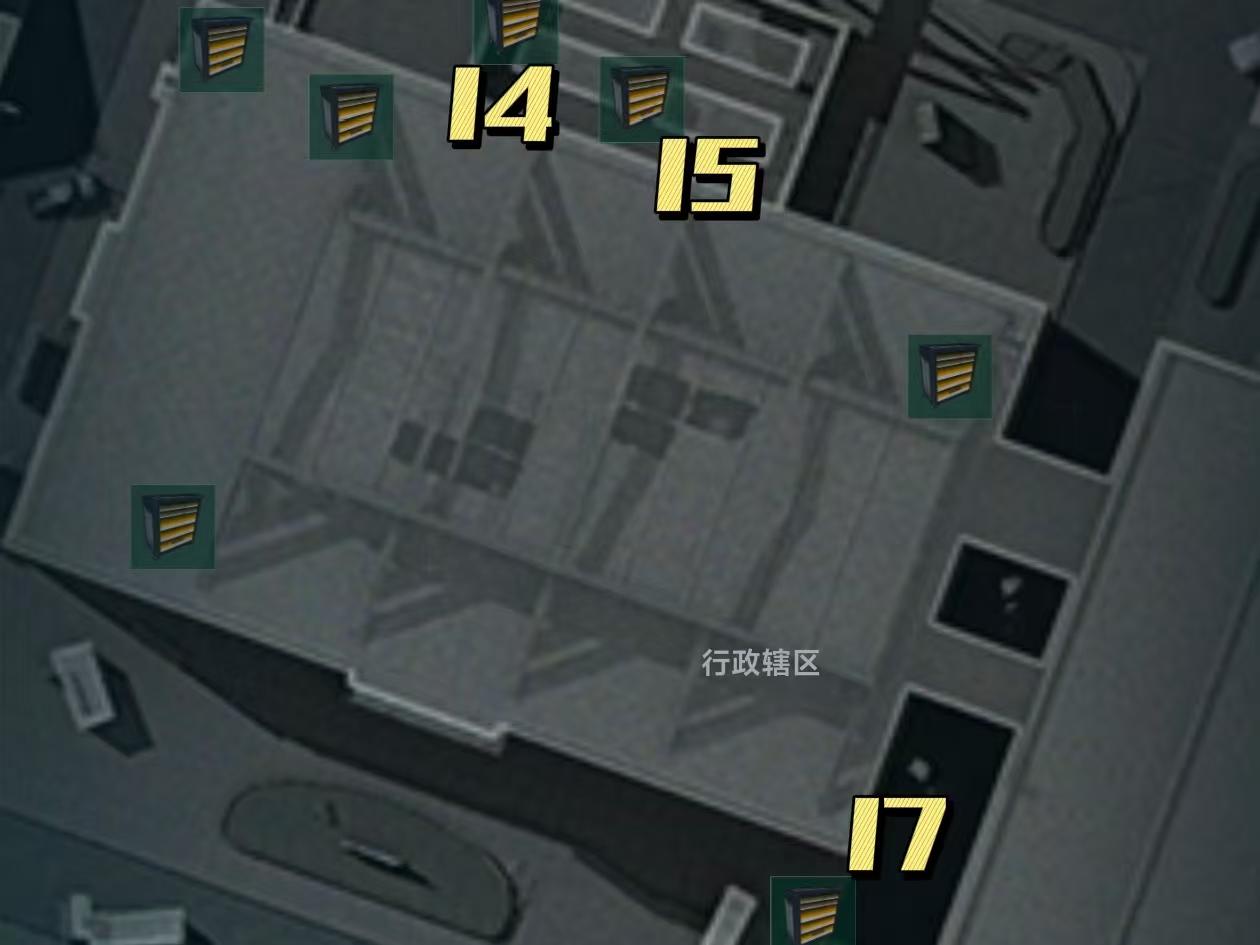 行政楼东侧的停车场大家可能再熟悉不过了,9号工具柜就在白色货车紧邻的车库里面,进入之后抬头看向二楼就能看到了;我们来到西楼的一楼左侧,也就是服务器旁边一堆配电箱这里找到10号工具柜,转身直接跑向对面服务器,就能非常容易地看到11号工具柜;上到二楼图片标注位置,找到里面有一整面铁栅栏搁这配电箱的房间,就能找到12号工具柜;我们找到可以通过升降梯爬上来的房间,这里面就是我们要找的13号工具柜。