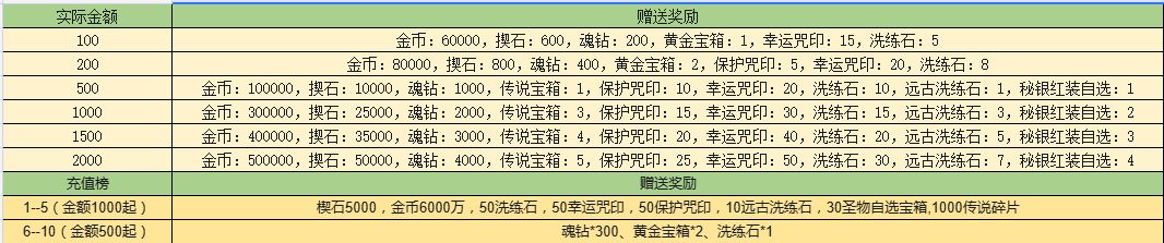 2、奖励内容叠加且循环,福利领到手软。(例如玩家实际支付金额为3000,那么领取到的礼包为100+200+500+1000+1500+2000+100+200+500+1000)