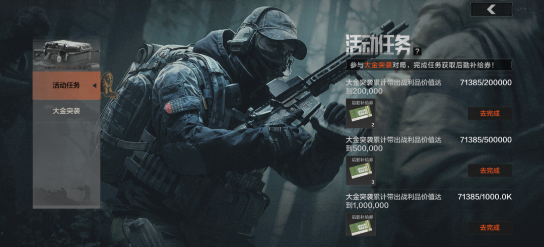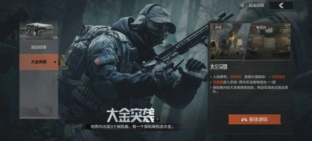 点击【活动】-【玩法模式】-【大金突袭】即可进入【大金突袭】模式。该模式入场需要消耗30000柯恩币,且带入的装备价值必须大于150000柯恩币。参与大金突袭对局,完成任务还可获取后勤补给券。