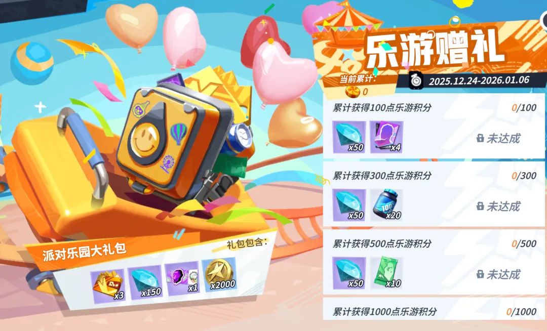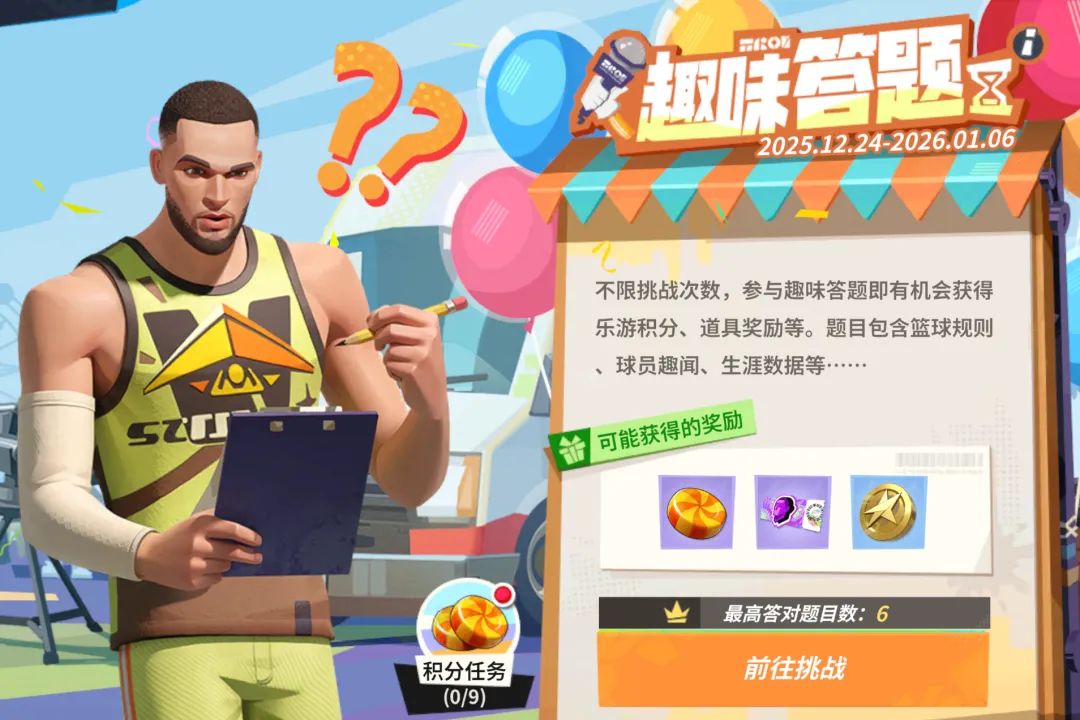 [乐园赠礼]活动将于12月24日上线,参与趣味答题、节奏投篮等休闲玩法赢取乐游积分,累计积分即可领取钻石、明星天赋卡、潜能精华和本期大奖乐园大礼包。