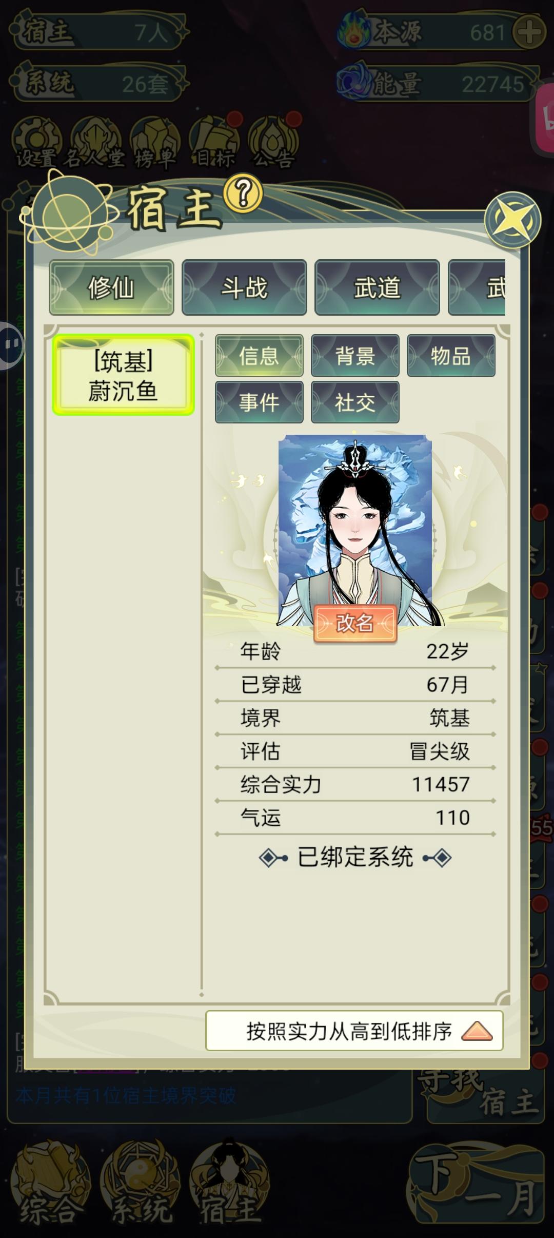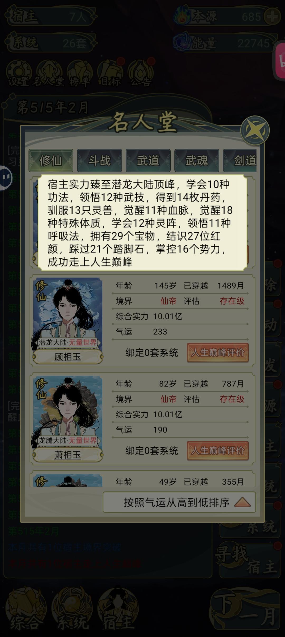 这这游戏当你扮演一个系统之神,把老乡带到异界之后就不管了,甚至把系统也剥离,不管他遭遇了什么围攻都选择无视,你会发现其实穿越者不死不灭,只要能打赢围攻,就有很多收获,境界就很快提升。我这个观察对象是从出窍境开始反转,开始能打赢围剿势力,从一直输到,输多赢少(出窍),再到常胜。哪怕你不给他金手指,但是他不死,战力越高,胜率就越高。打赢了之后,收获其实很高。我之前带着最顶级的系统养偶尔养一养那些角色的时候,87岁到100多岁差不多也就飞升存在级,而且用到了各种系统的辅助功能,也就是不停的开多重挂。但实际上我们这个观察对象,她飞升也没用多长时间,也就291年。经常看小说的都知道。300岁大乘可能都算是天赋异禀,更别说只用差不多不到300年的时间就变成存在级,只能说这里的穿越者还是太超模了。