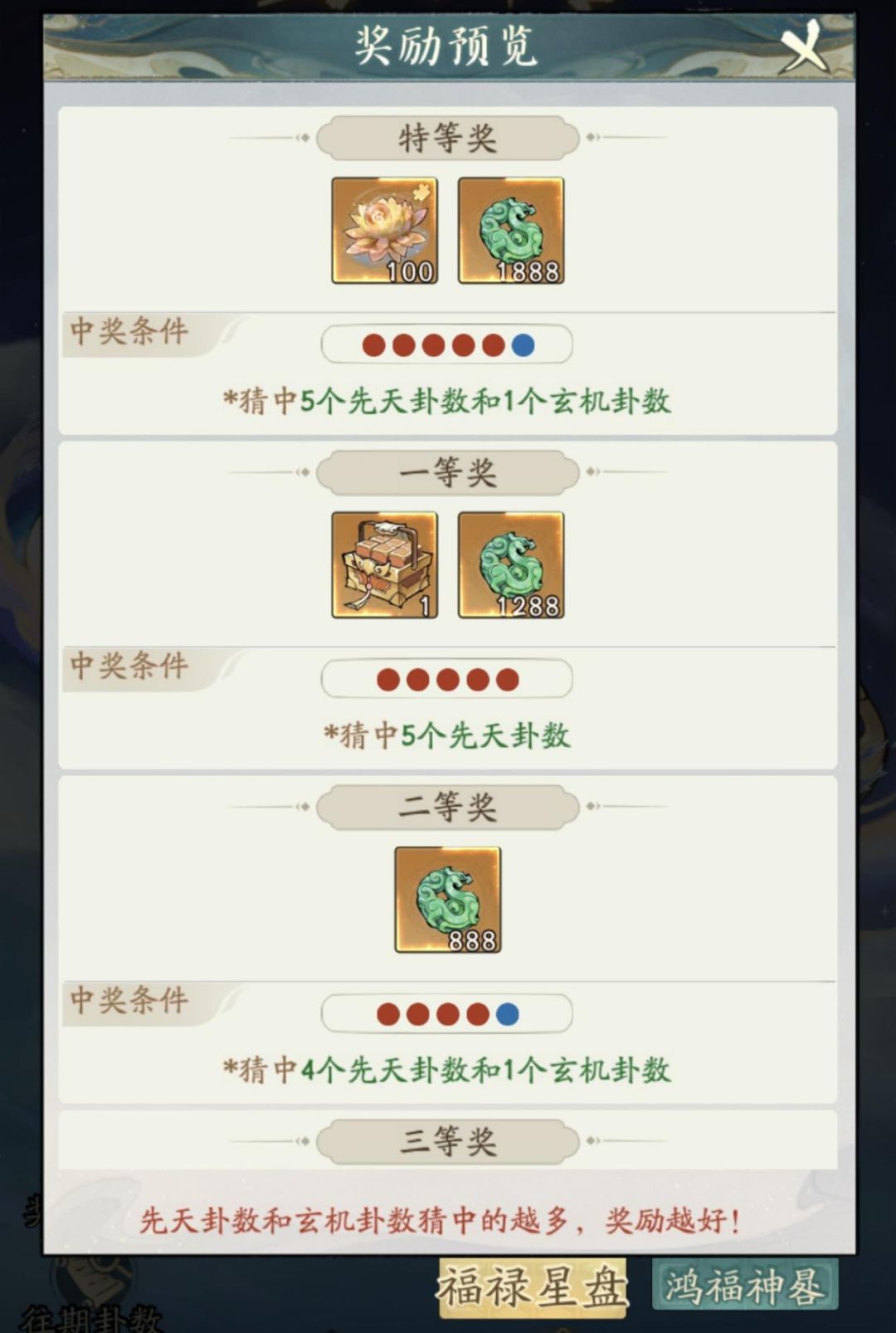 开奖时,将根据您所选的卦数与开奖卦数匹配数量判定奖励等级,匹配的数量越多,奖励越丰厚!