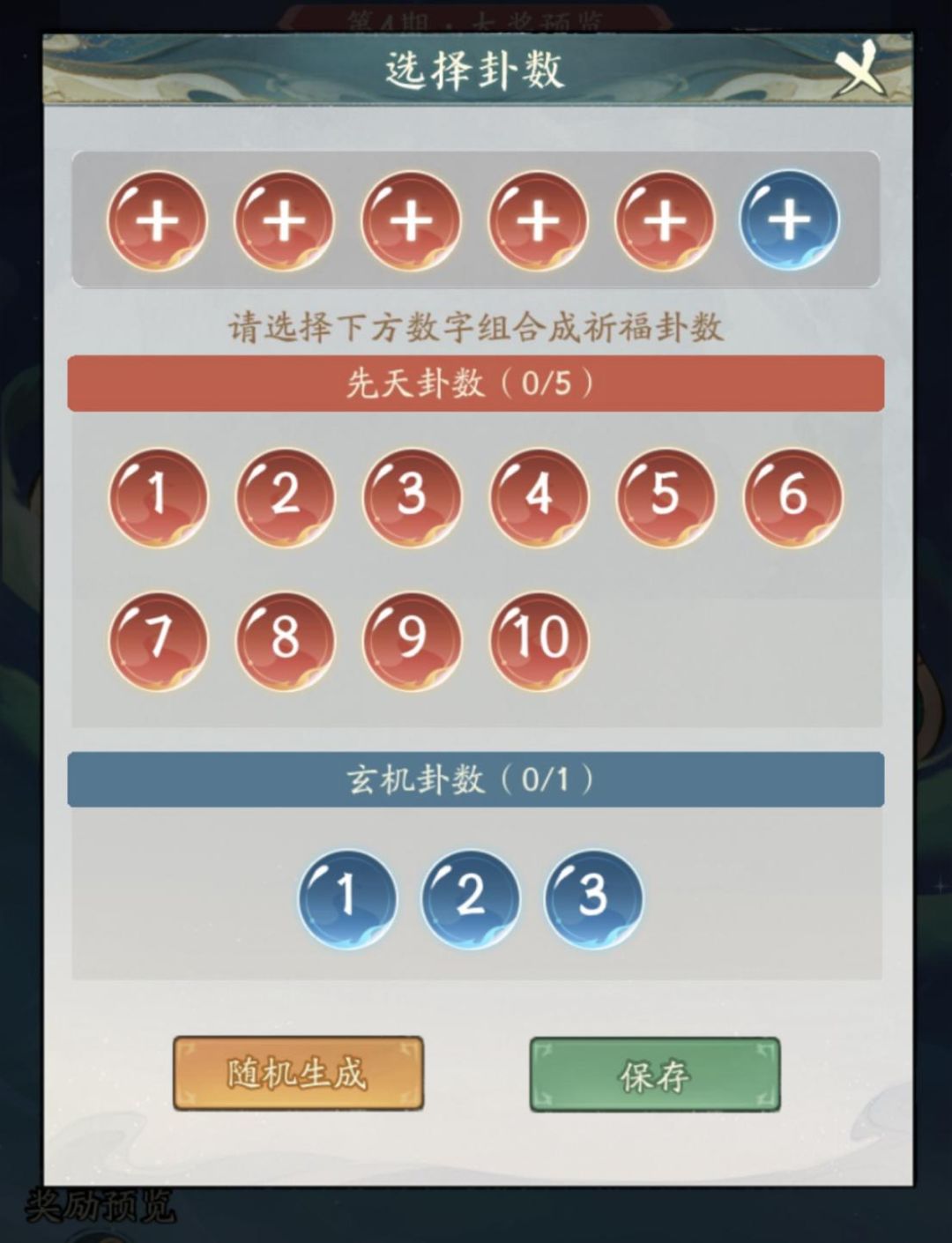 一念祈福,万数归真。参与祈福后,道友需要从【先天卦数】和【玄机卦数】中选择规定数量的卦数、组合成你本期自选祈福卦数,并等待开奖。