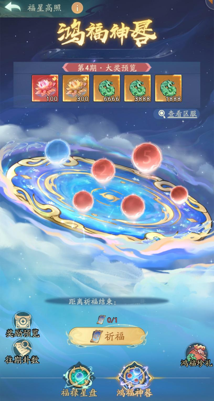 活动共有两种祈福星盘供道友选择,不同星盘的奖池内容不同。活动期间,道友点击“祈福”按钮,即可参与对应奖池。