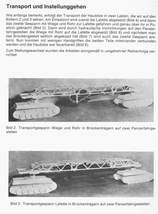 和典型的德式火炮一样,这种武器非常沉重,炮管及摇架就超过15吨,战斗状态下的重量高达50吨。因此,运输时必须拆为两个部分,炮身和炮架分别悬挂在两台运输车携带的桁架下面,共使用4辆运输车。待运输车到达指定地点后,先由第一组放下炮架,再由第二组将炮身放到炮架上面,然后将桁架倾斜到一侧,解放空间。之后,仅需几个简单的步骤就可以将火炮组合完毕。使用时,需要推车搬运炮弹,通过炮架尾部的手摇装填台及推弹器进行装填。由于炮弹是分装的,这个操作要重复两次。