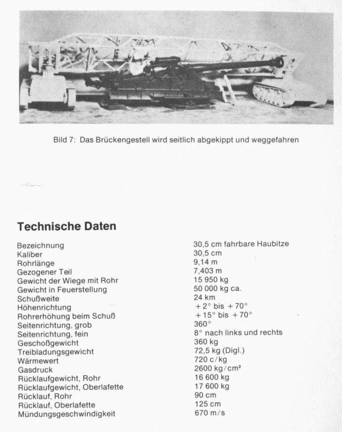 该305mm火炮的炮口初速为670m/s,最大仰角70°,射程24公里,发射360千克重的炮弹。炮管长9.14米,使用螺式炮闩,前部装有炮口制退器,这种设计在这一级别的火炮上不太常见。炮架设计和17cm K18很相似,带有旋转底板,可原地进行360°全向射击。