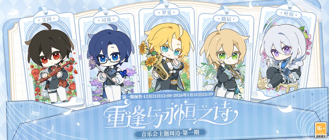 「重逢与永恒之诗」系列·第一期:纪念票、印象唱片、线稿明信片、Q版应援棒、拍立得套组、交响乐团毛绒娃娃、Q版方形马口铁徽章、Q版彩窗亚克力杯垫、Q版打卡棒、毛绒吱吱挂件、Q版金属徽章、线稿帆布袋、“这才是真正的音乐”马口铁徽章。