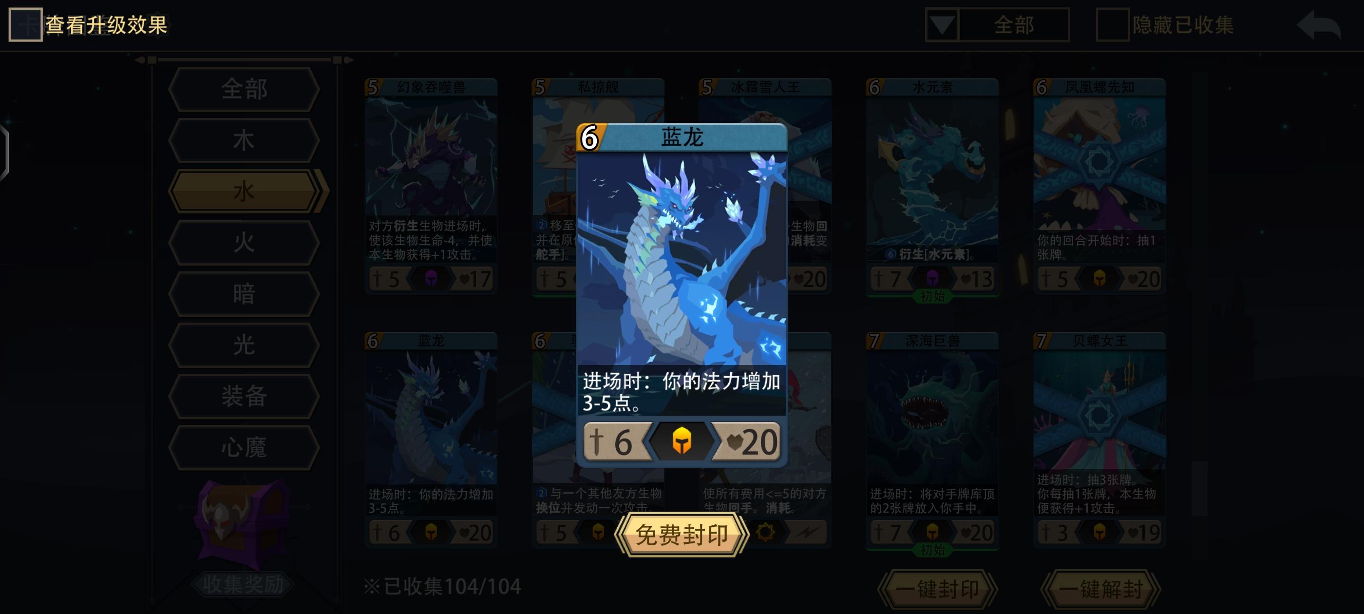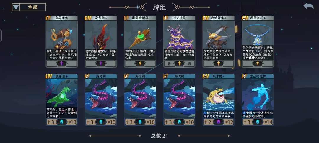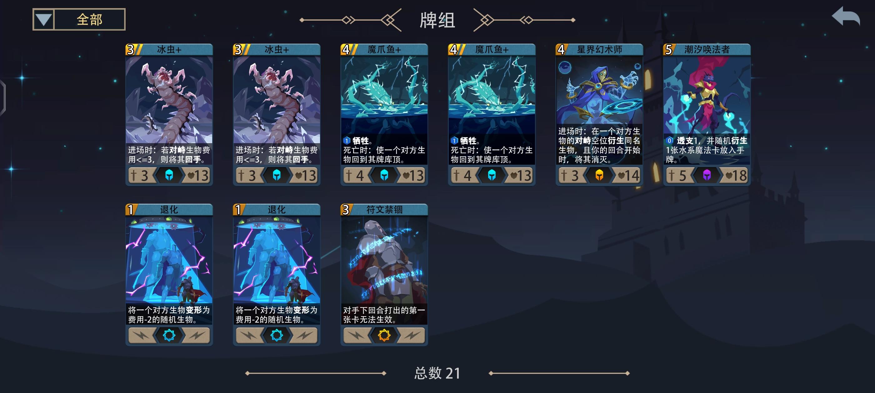 卡组构筑:开局删2张利齿鱼 抽两次生物/魔法 一次装备卡 如果前两次抽卡比较脸黑 可以不抽装备再抽一次生物/魔法 最好是涨法力的卡或低费解场卡配一张5~6费的大哥开局(蓝龙 潮汐唤法者等)没打手用魔灵守护替代也行 因为水系解场卡比较多 所以英雄&生物装备以补伤害为主