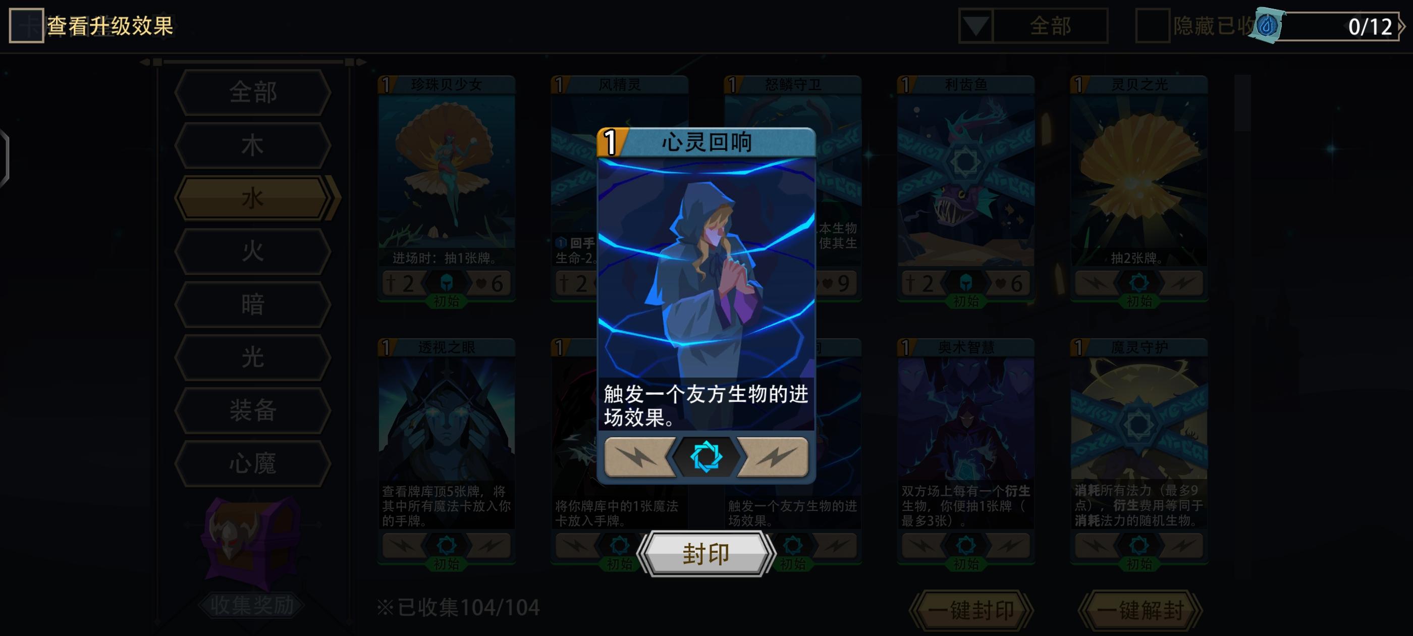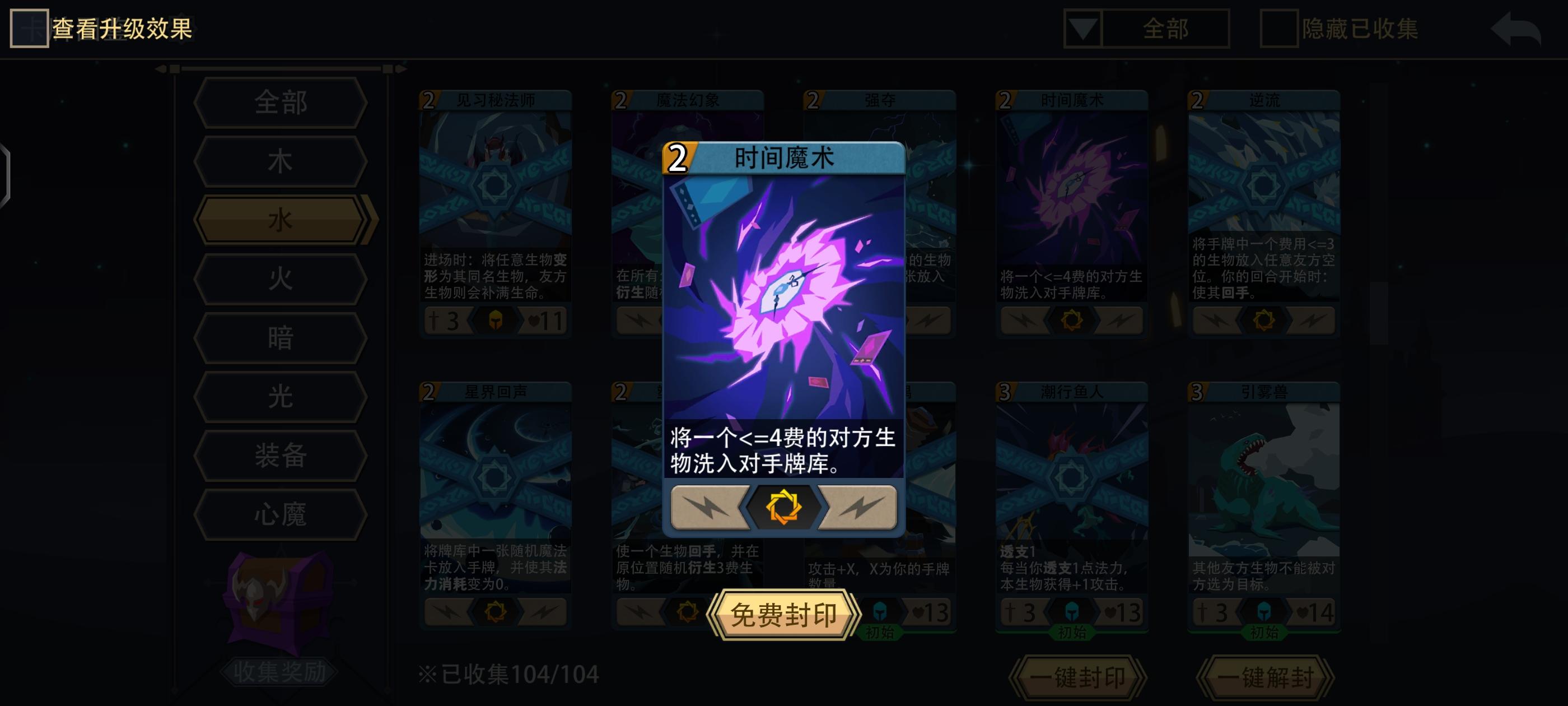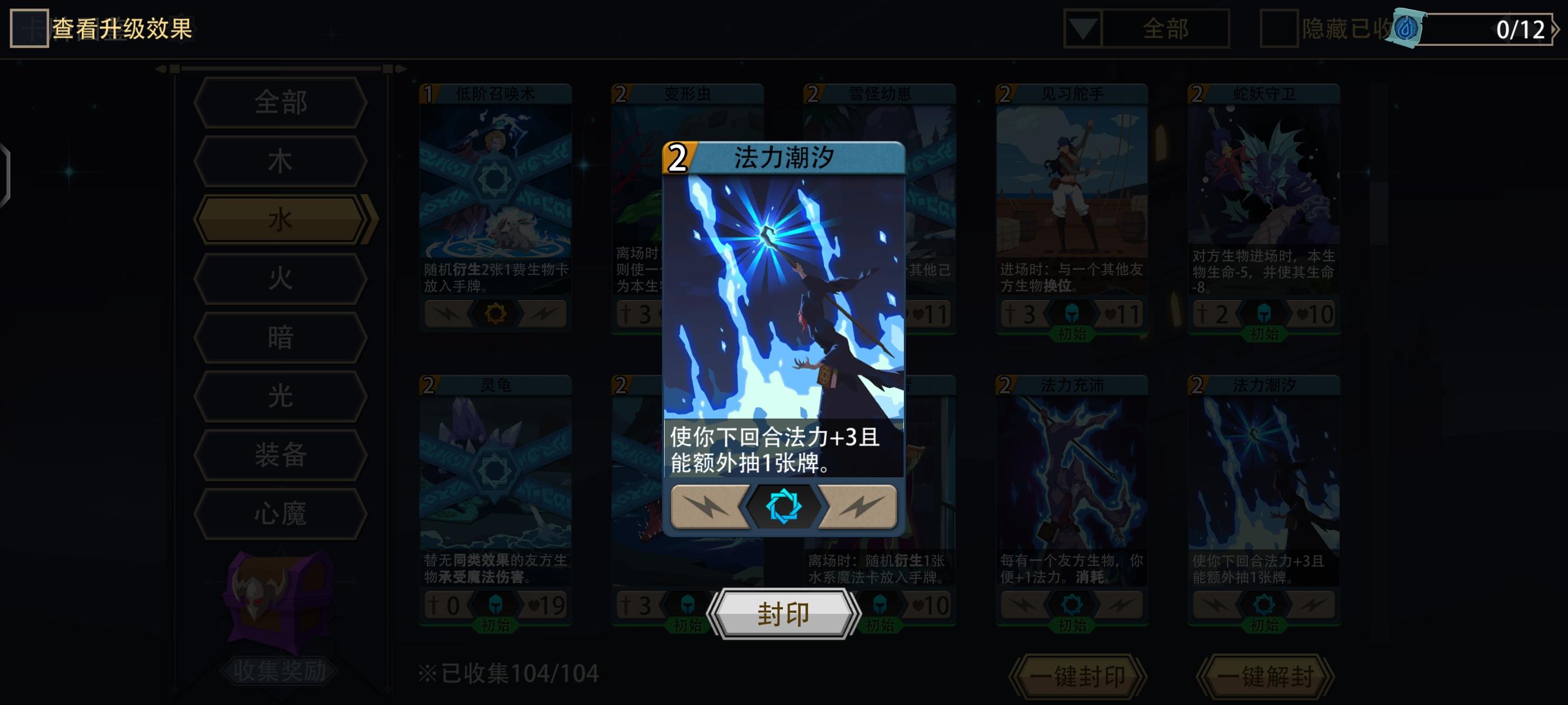 卡组构筑:开局删2张利齿鱼 抽两次生物/魔法 一次装备卡 如果前两次抽卡比较脸黑 可以不抽装备再抽一次生物/魔法 最好是涨法力的卡或低费解场卡配一张5~6费的大哥开局(蓝龙 潮汐唤法者等)没打手用魔灵守护替代也行 因为水系解场卡比较多 所以英雄&生物装备以补伤害为主
