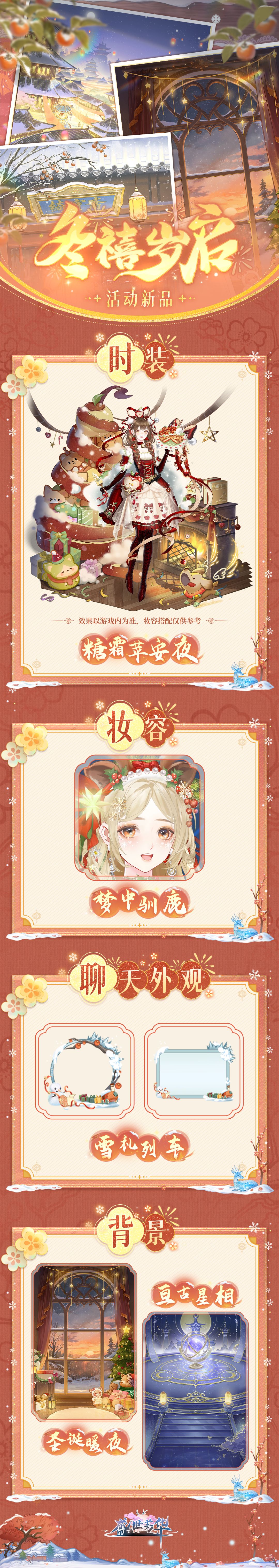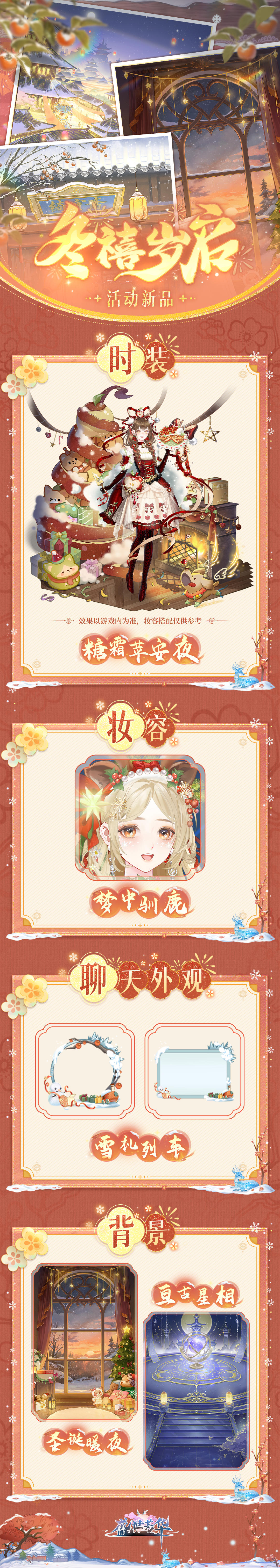 活动期间,通过「冬禧岁启」内玩法获取活动积分【冬瑞雪】,可以在活动商城兑换天赐时装【糖霜苹安夜】、妆容【梦中驯鹿】、背景【亘古星相】、聊天外观【雪礼列车】等珍贵物品道具!