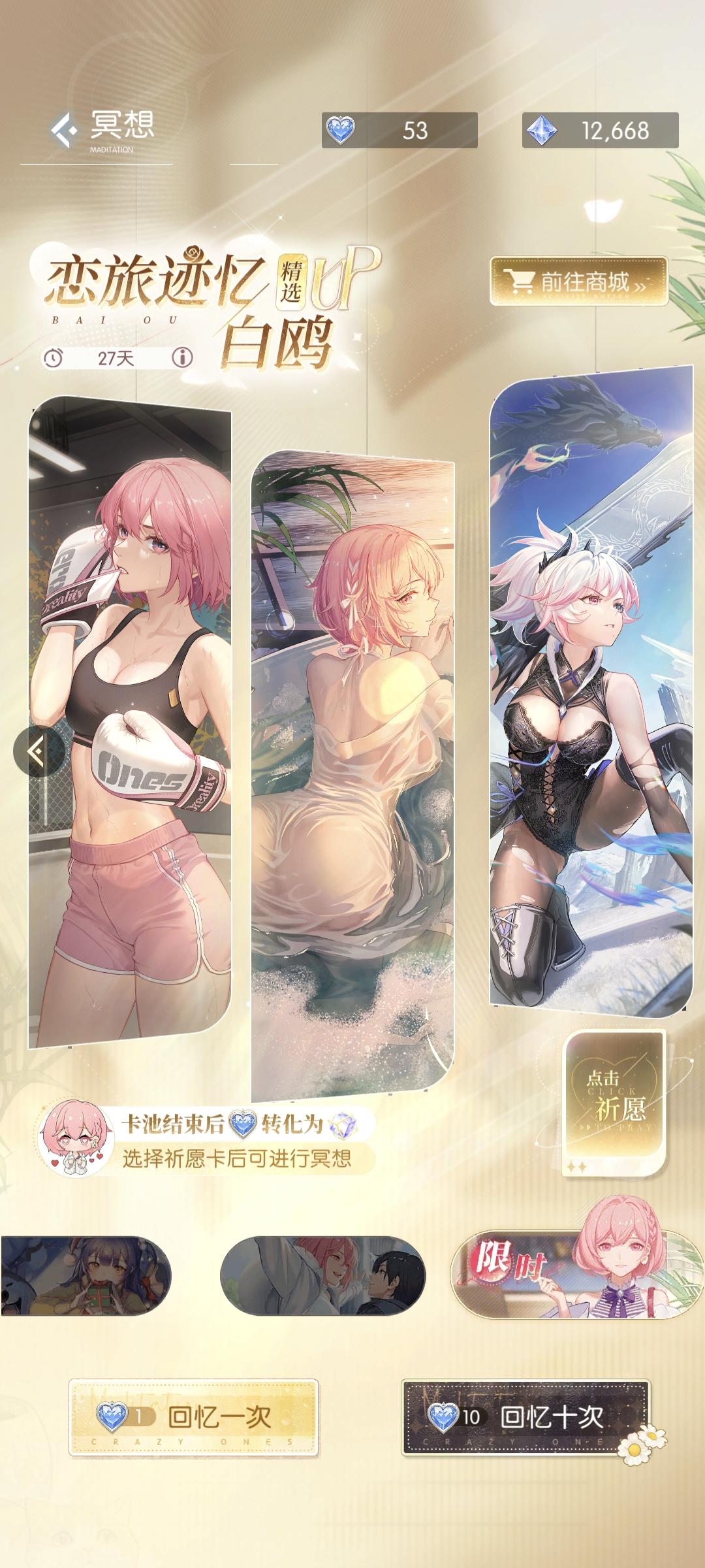 此外前面说的钻和心动券,也是非常值得关注的点。这两个东西的爆率比想象的要高不少。钻方面,我五十抽最终花了大概24000钻,也就是实际花费差不多是理论值的九分之八。而心动券我也拿到了51抽,考虑恋旅那边抽奖的价值这么买还是划算的。叠加相关活动奖励,脸不那么黑的朋友还是可以尝试养一养白鸥的婚卡的。