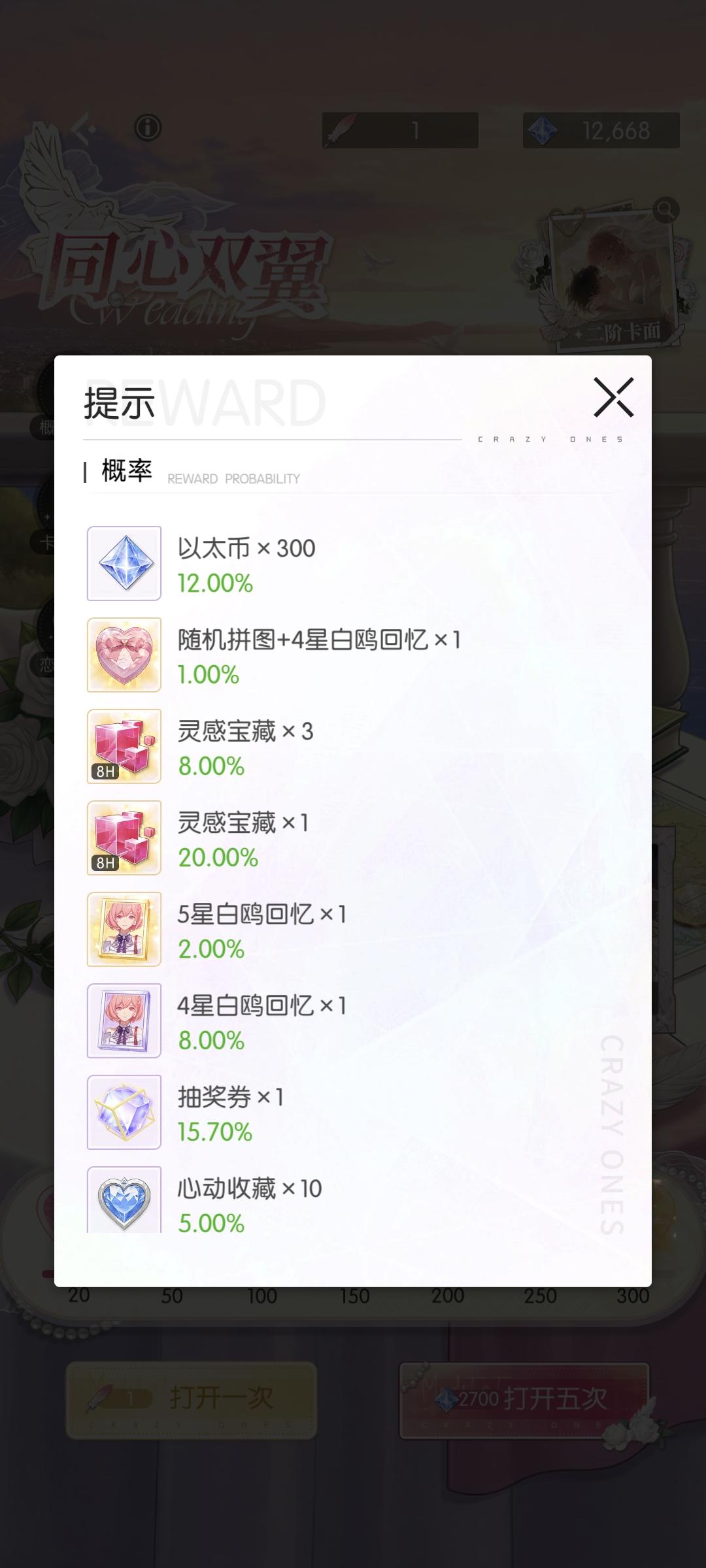 概率一览,关键在于本截图一头一尾的钻和心动券