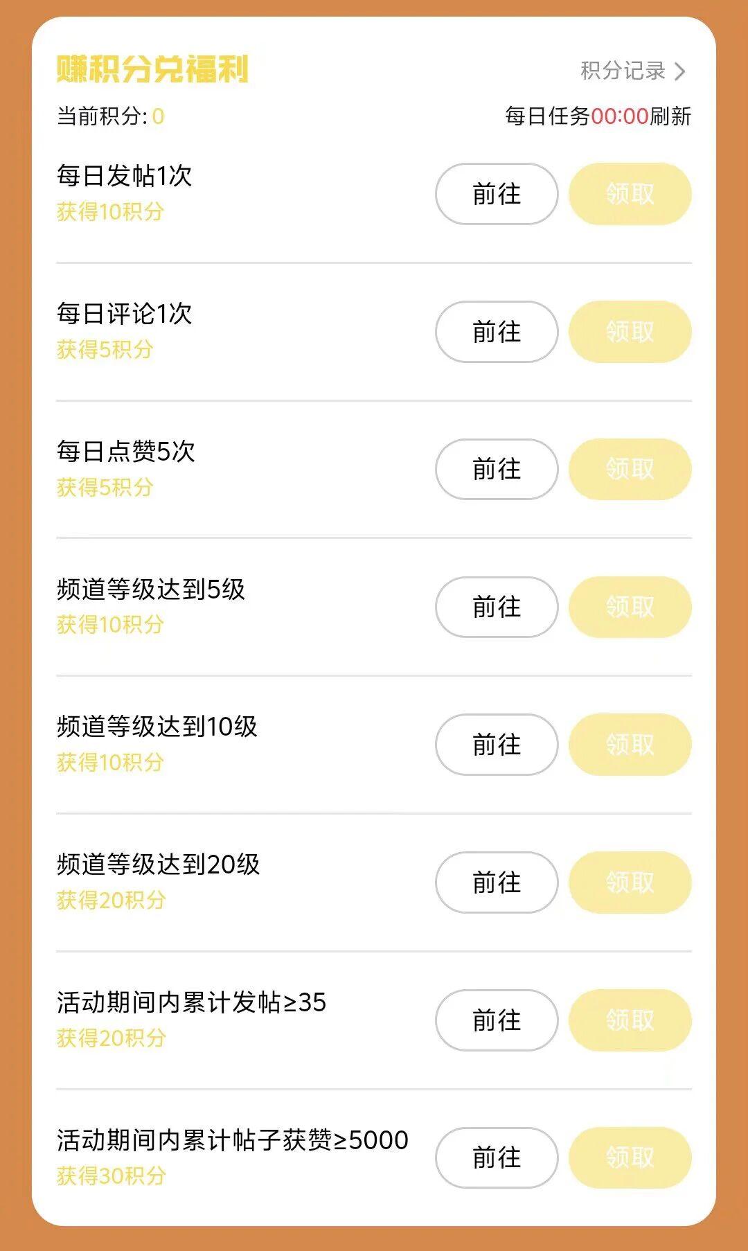 二、完成任务可获取积分每日完成频道活跃任务可获得积分!定好小闹钟每天报道啦~