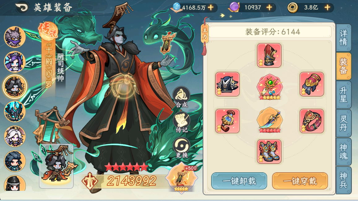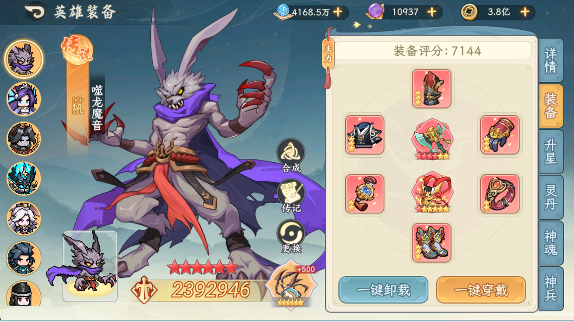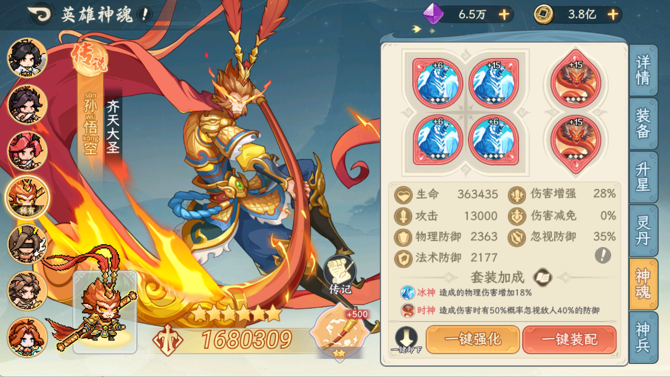 大家好,这期给大家带来齐天大圣孙悟空的pve测评,这次推出新人物也加强了九尾狐的技能,想让孙悟空跟九尾狐绑定在一起,因此配队为孙悟空+九尾狐+阎罗,九尾狐妖族增伤机制跟造块契合这两大C,在孙悟空6星神兵之前九尾狐只需要4星人物即可上场。为了测试的准确性,我用了以下的阵容(不单减任一防御效果)