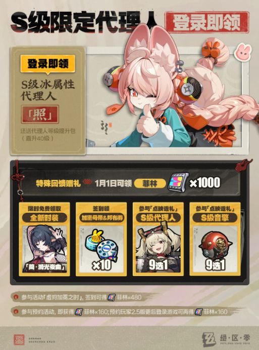核心福利方面,版本期间玩家可限时免费领取全新限定 S 级代理人「照」,配套直升 40 级养成补给同步送出,助力快速成型战力。代理人「简」的全新时装「漪光夜曲」将开启 100% 限时折扣,玩家登录即可免费解锁。1月1日将发放特殊回馈赠礼菲林×1000,版本内签到还能领取「加密母带 ×10」「邦布券 ×10」,为抽卡提供充足资源。