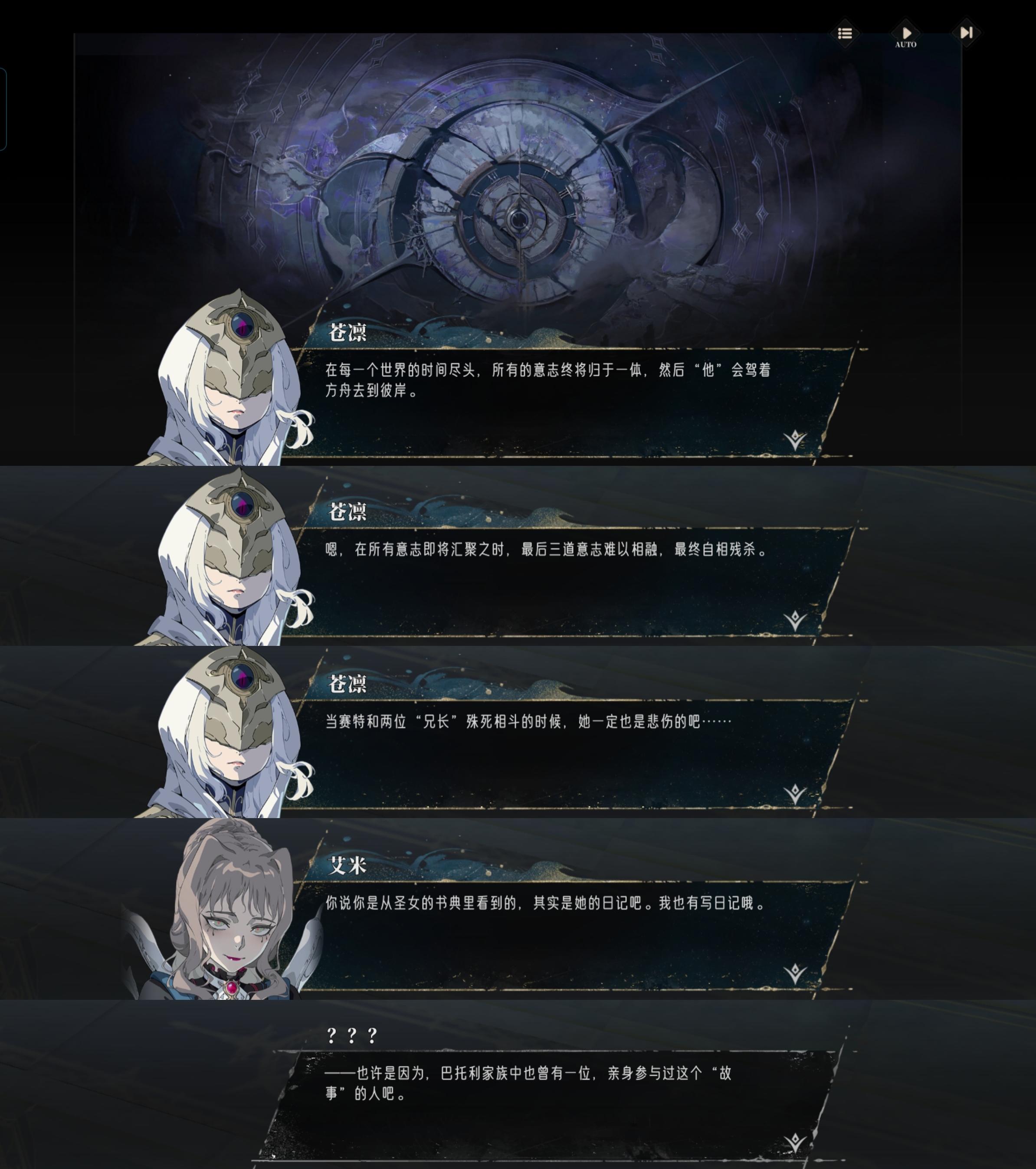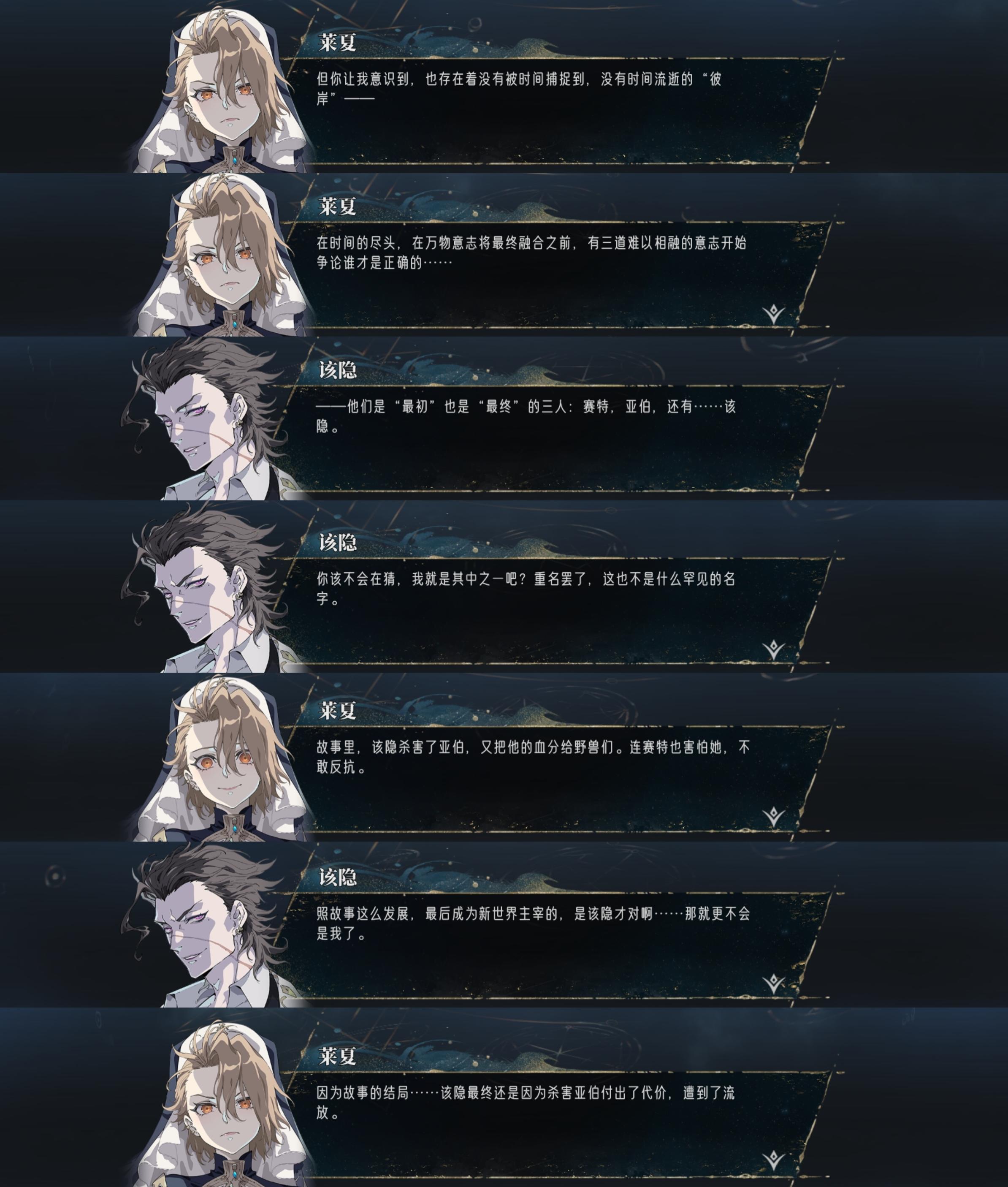 ✅莱夏提到“时间最初的三兄妹”(16-8,图5)时,已经猜到该隐的真实身份了(虽然他不承认),所以之后会说该隐是“圣女的兄长”(17-10,图6);