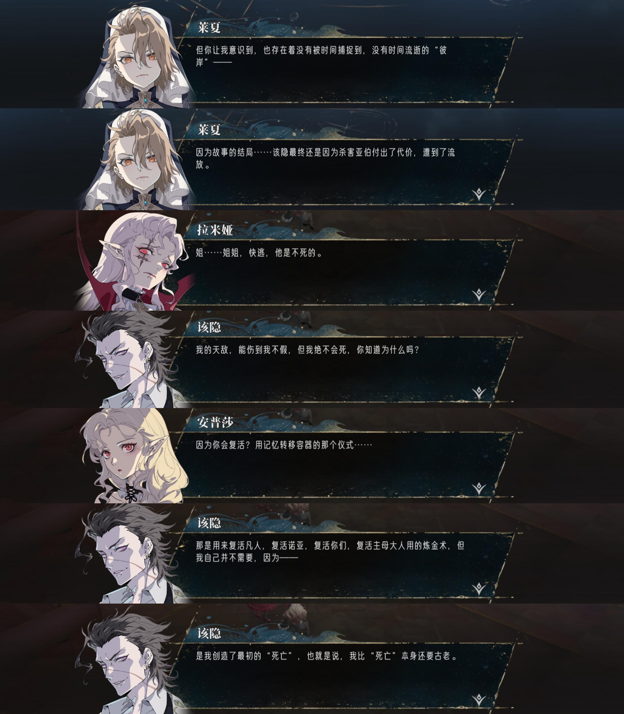 ✅眷属名册和剧情片段(图9)里都暗示了,该隐曾在教会和阿尔伯特一起学过炼金术(注意这里说的是学习,所以时间点应该在阿尔伯特收徒之前,那就非常古远了);而该隐提到阿尔伯特的语气感觉两人确实已经认识很久了,而且他们应该是很了解对方的关系,不然该隐不会用“天敌”去形容阿尔伯特;