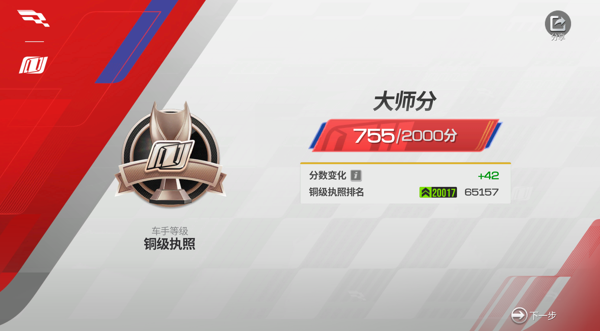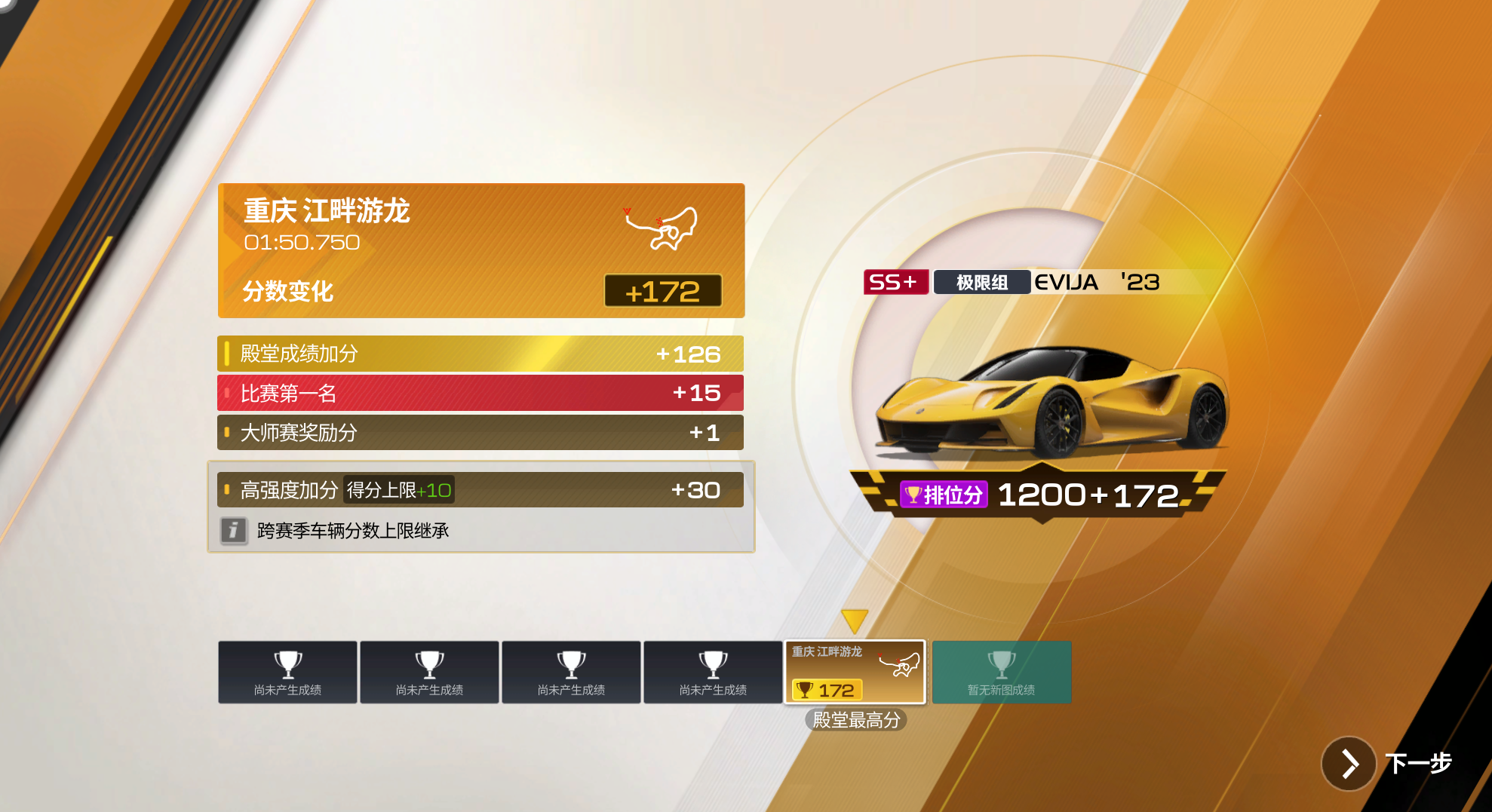 在大师晋级赛中获得最终胜利将会固定获得+51分奖励。若车手不幸在【入围赛】阶段失败,需要重新积累分数后再参与晋级赛;