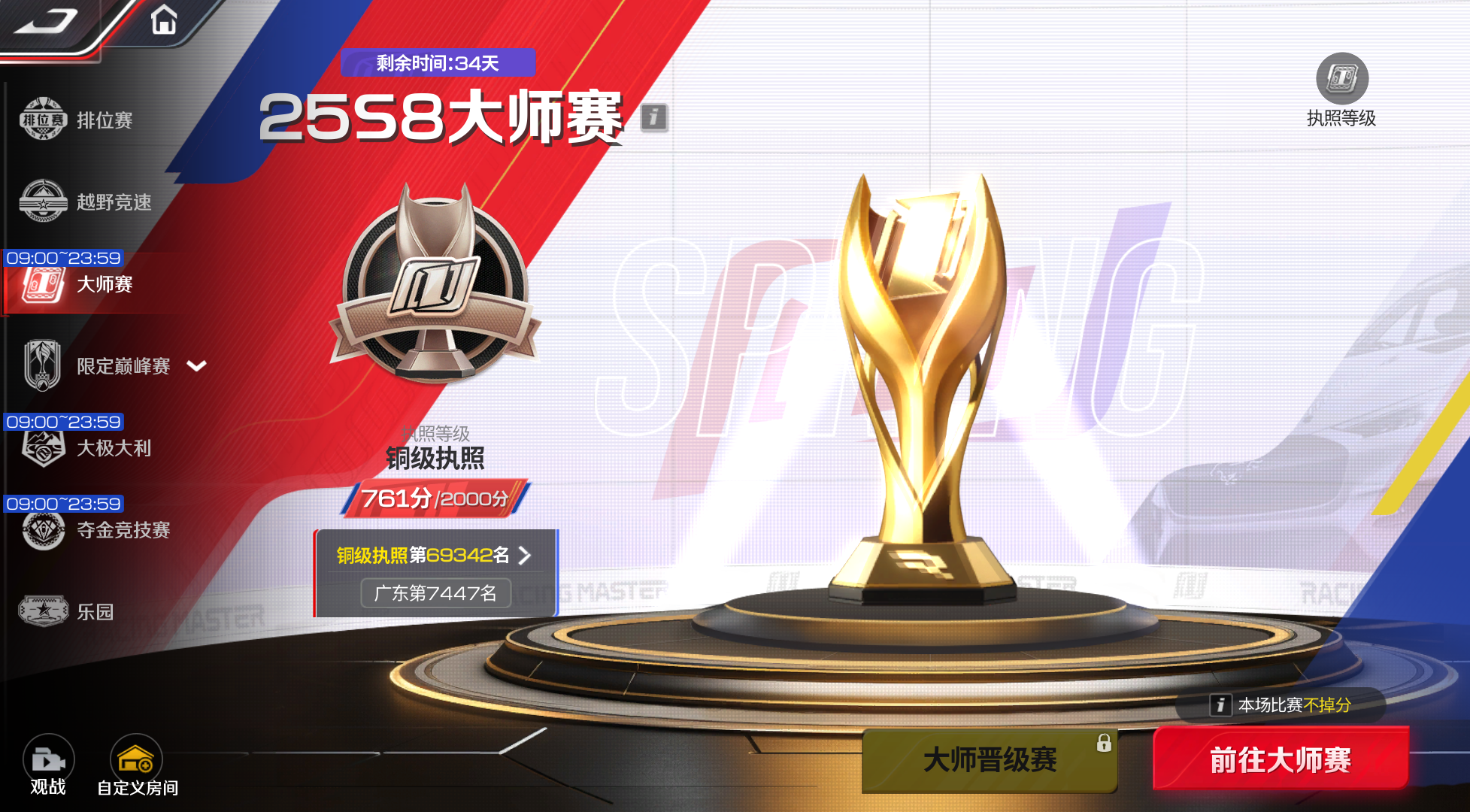 当然,通往高等级执照的道路充满挑战与策略。当你拥有金级执照及以上的高级执照且大师分累计达到晋级门槛时,激动人心的 【大师晋级赛】 就将开启!