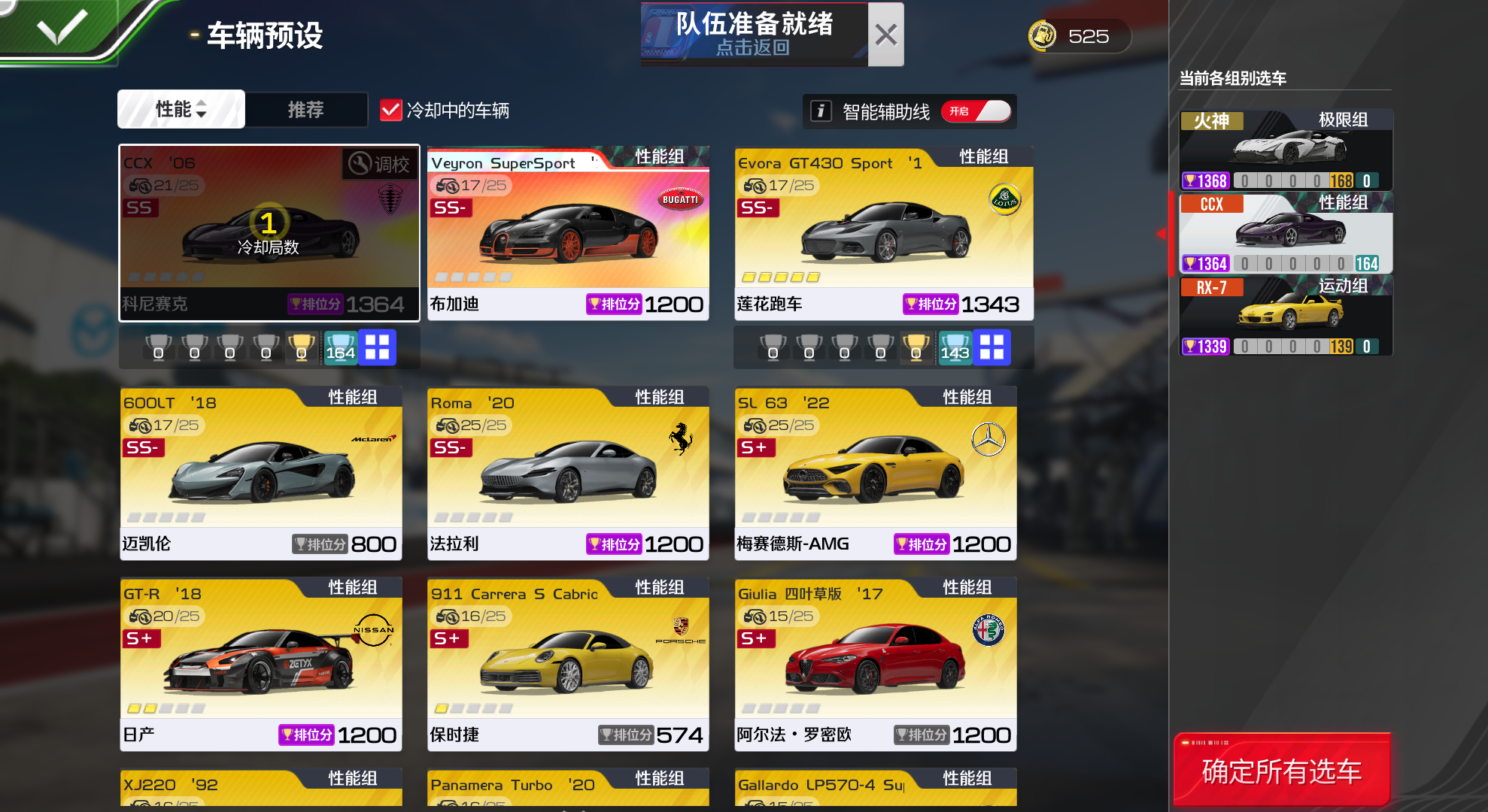 大师赛需要在匹配成功后手动选择车辆。选择车辆时,将会显示本场比赛可能出现的赛道,以及对手当前所选择的车辆。每辆车在选择过后,将会需要一定的冷却场次,每进行一场对应组别的比赛,冷却场次减少1场。冷却结束后的车辆可重新使用。