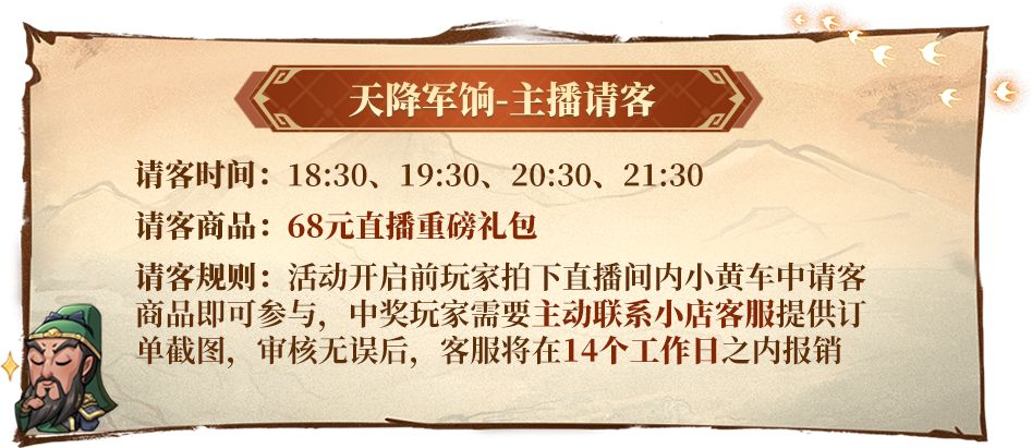 活动规则:下单指定商品,主播将在直播间半点抽取一位玩家作为锦鲤,直接请客免单!订单越多抽中的几率越大哦!