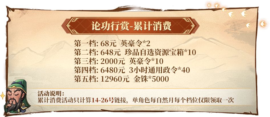 活动规则:累充玉符到一定额度后,次月账号内自动下发赠礼道具,请主公关注游戏内邮箱。