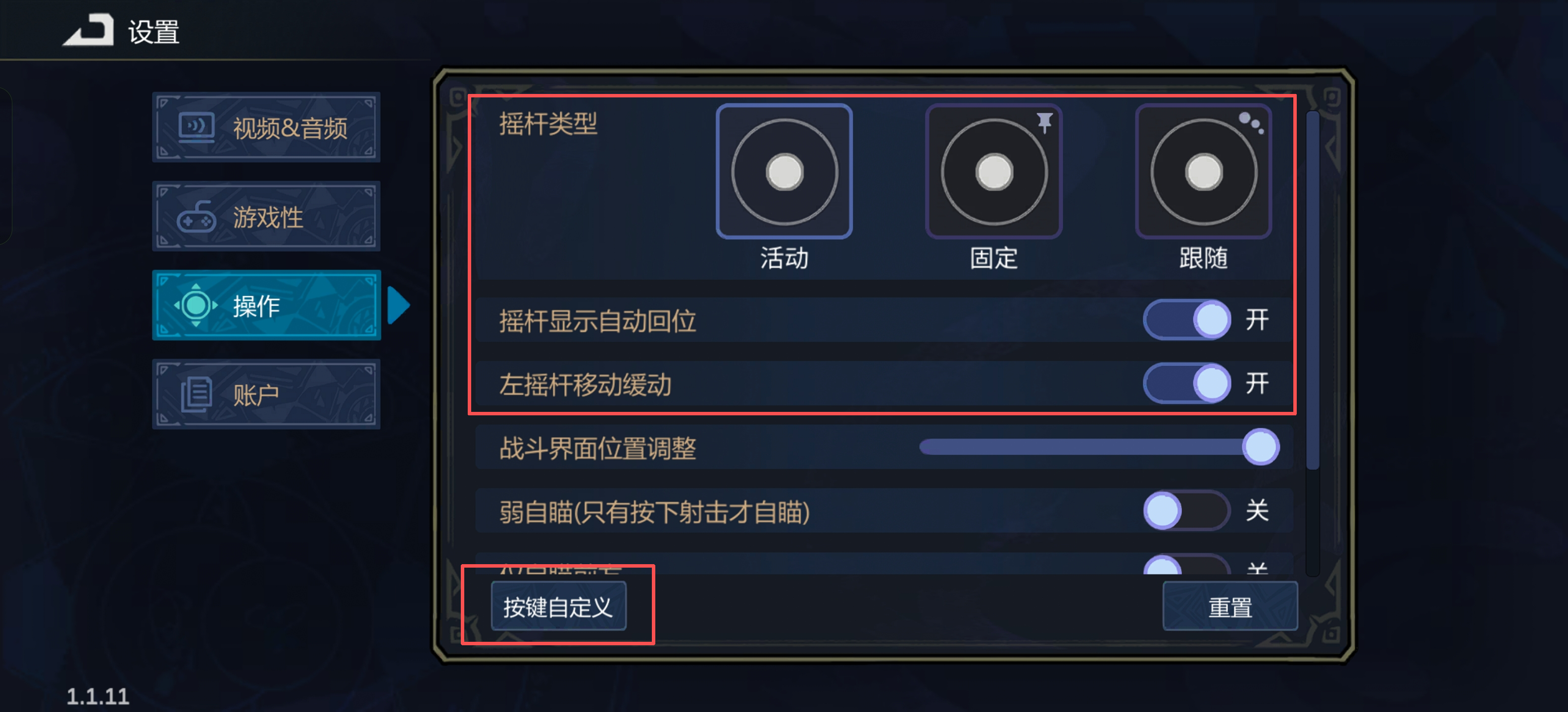 可通过调节设置界面中"摇杆类型"、"摇杆显示自动回位"、"左摇杆移动缓动"以及"按键自定义"来满足个人喜好