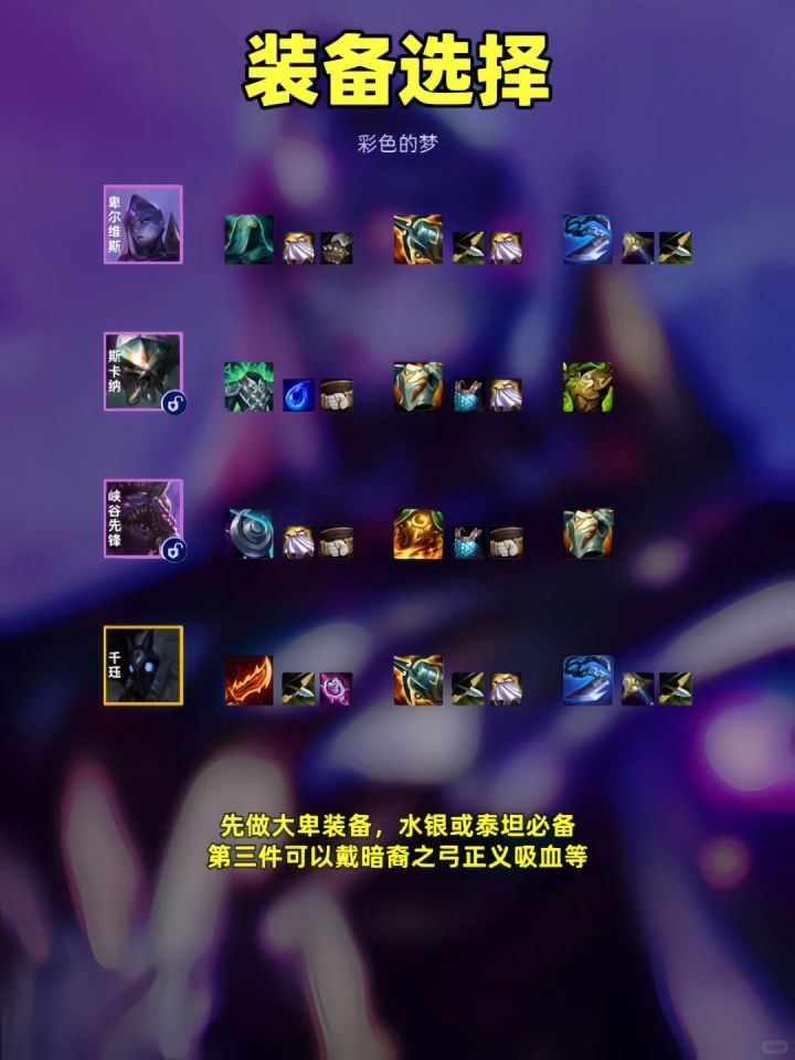 装备要做一个免控,水银或泰坦要有,其他的差不多就可以,比如羊刀正义饮血都可以。