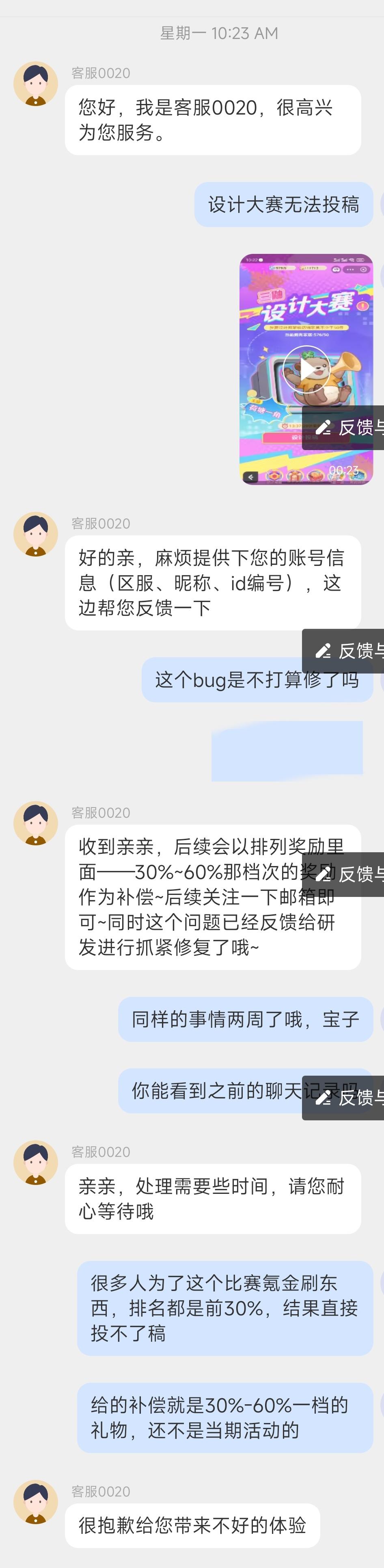 zfb渠道服一个月玩家,设计大赛是不给参加的(p1),从12月6日的设计大赛就开始有宝子在跨服频道发自己不能参加设计大赛,8号我去找了客服,并在当天晚上领到了补偿(p2),本周的设计大赛依旧无法投稿,15号我也去找了客服,到现在为止没有拿到补偿。(客服周末不在,晚上10点不在,活动结算时间为晚上10点)