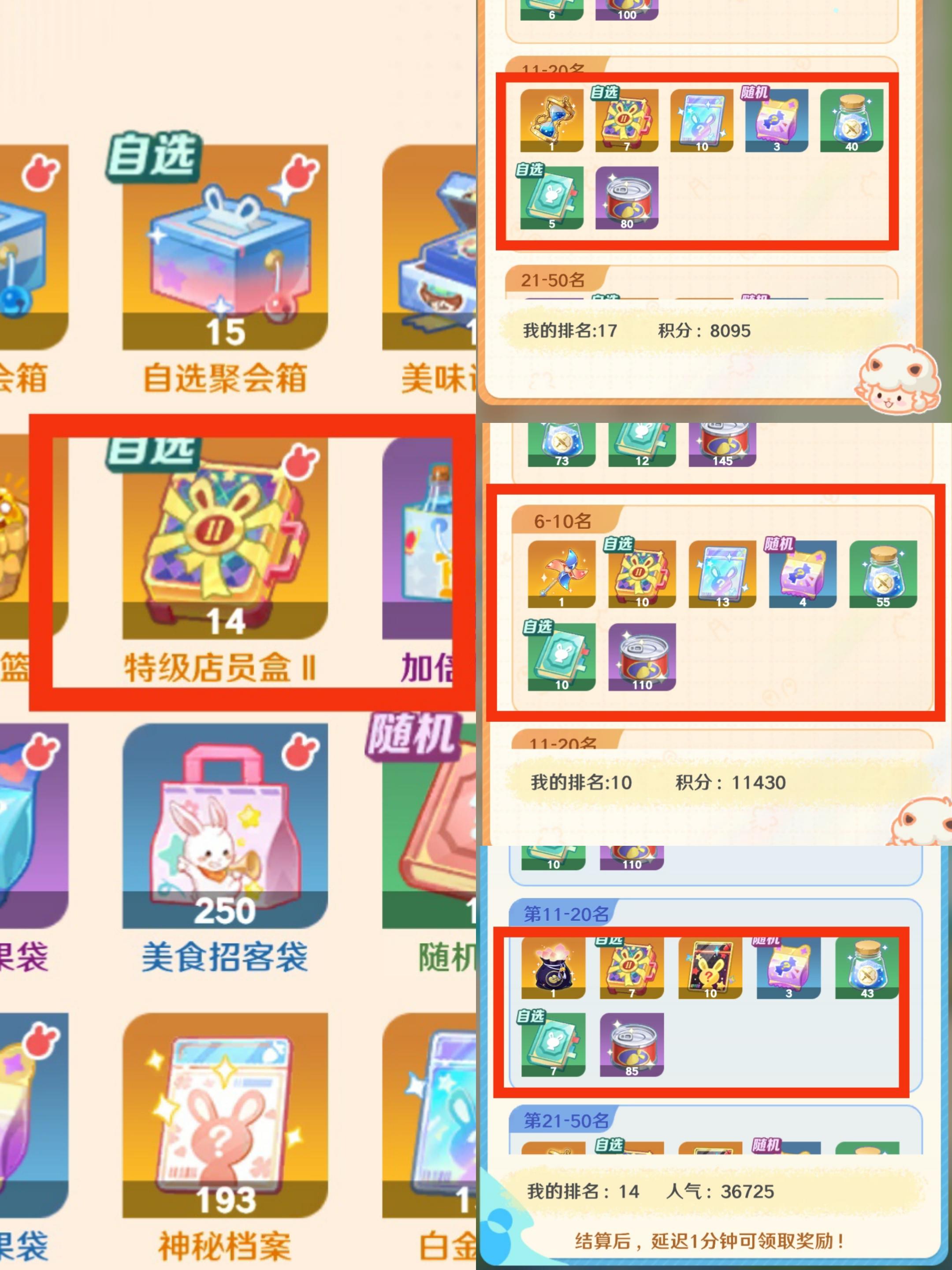 如图所见,今天结束的三个活动(浪花集市,聚会之星,招客之星),我的排名奖励为7个二级店员盒,10个店员盒,7个店员盒,最后背包里只有14个二级店员盒。哇哦,还有10个店员盒不会是自由了吧。
