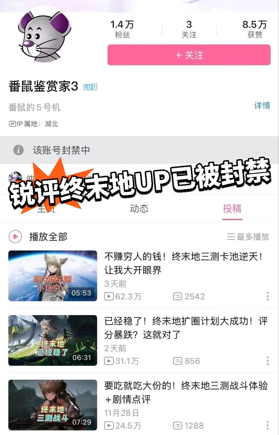 据悉,近日有UP因锐评终末地三测内容遭到封禁,