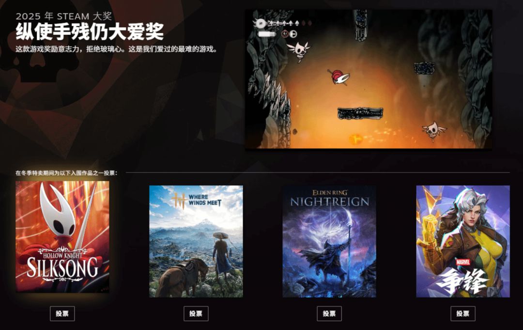 “纵使手残仍大爱奖” 聚焦难度与乐趣并存的作品,过往曾有《师父》等佳作获此殊荣。本次该奖项竞争激烈,同入围的还有《空洞骑士:丝之歌》《艾尔登法环:黑夜君临》《漫威争锋》等热门作品,涵盖硬核动作、奇幻冒险等多元题材。
