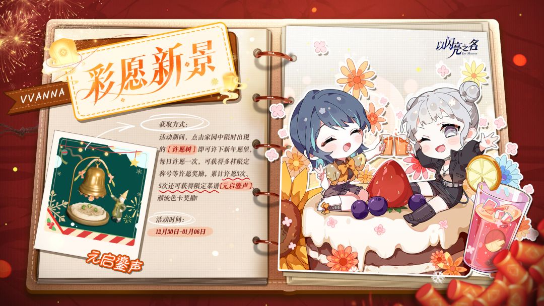 活动期间,与出现在家园中的许愿树互动,即可许下新年愿望。每次许愿都能获得一份许愿奖励,奖励包含限定新年称号和多种材料奖励,每种许愿获得的称号都不同,努力集齐所有新年称号吧!