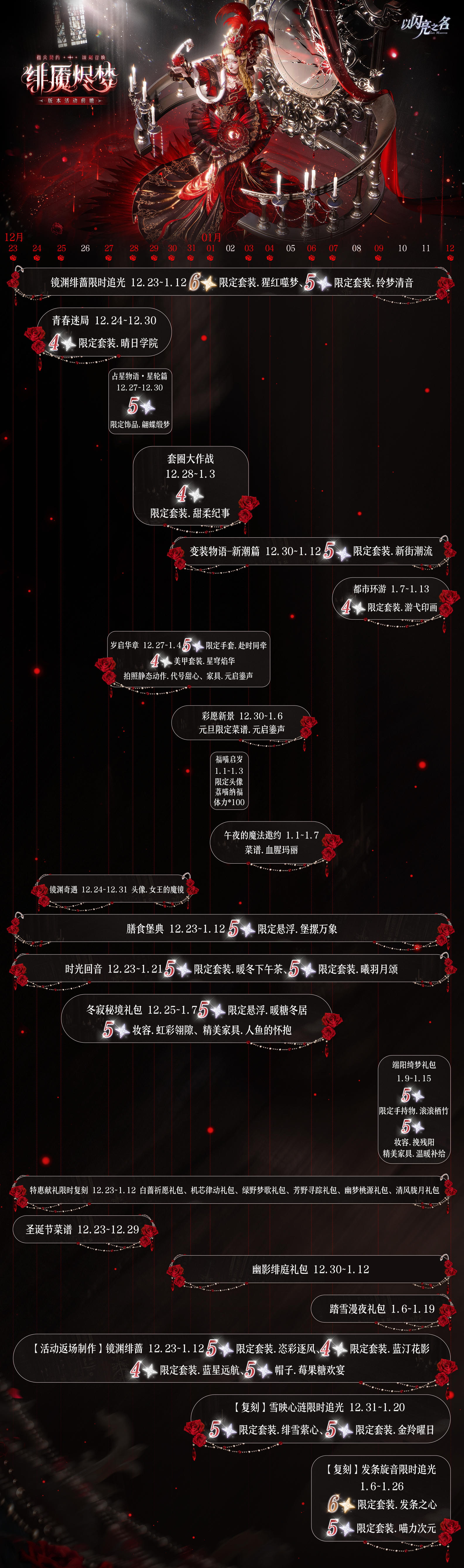 12月23日10:00,限定追光活动【镜渊绯蔷】上线!全新六星套装及SSR羁绊限时登场!该追光活动每登场25次内必得新限定六星套装部件(直至集齐限定六星套装)。集齐限定六星套装还可激活专属出场动作(摄像机镜头动态动作)【魇心夜冕】,并可在拍照-动态动作里使用。此外,【追光·镜渊分解】商店也将同期限时开启,通过分解该限时追光活动内的服饰,可获得限定五星时装部件【月海潮汐】、【昆仑神晖】、【爱意讯号】及拍照背景【空寂尘光】、限定家具、头像装扮、聊天装扮、拍照道具、镜渊风向标、心念之蝶、知之钥、金币等材料道具!